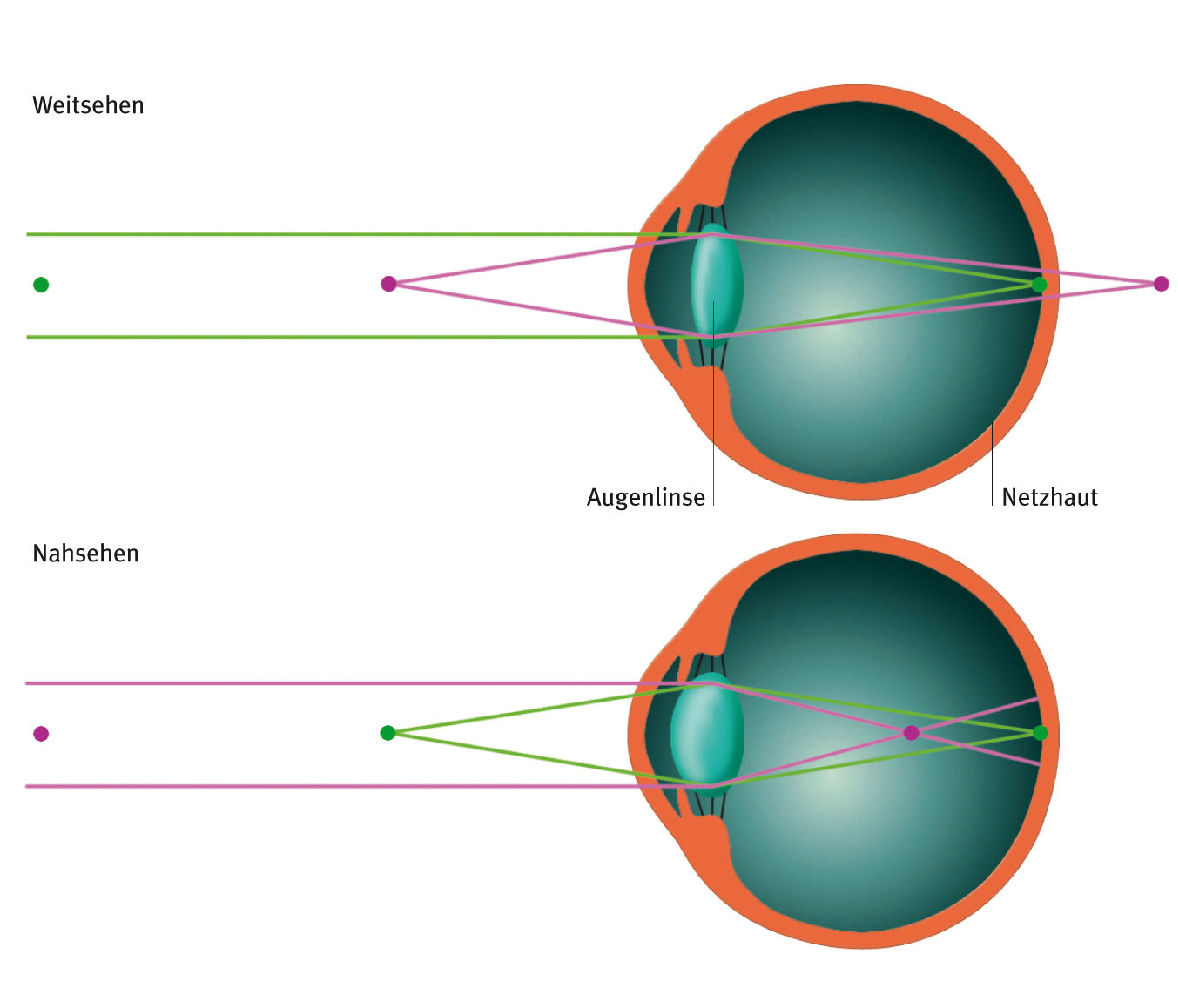 Durch Akkomodation kann beim Weitsehen ein entfernter Gegenstand (grüner Punkt) durch die Streckung der Augenlinse scharf auf der Netzhaut abgebildet werden, während der Schärfepunkt eines nahen Objekts (violetter Punkt) dahinter liegt. Beim Nahsehen sorgt die gewölbte Linse dafür, dass der nahe Gegenstand (grüner Punkt) scharf auf der Netzhaut abgebildet wird, während sich die Abbildung des weiten Objekts (violetter Punkt) vor der Netzhaut befindet und daher unscharf wahrgenommen wird.