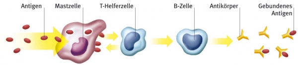 bestimmte Substanz an den Oberflächen von Zellen oder freie Substanz, z. B. Bestandteile von Pflanzen, Nahrungsmitteln oder (andere) Proteine, die im Körper zur Bildung von speziell gegen sie gerichteten Antikörpern führen. Das Immunsystem bildet diese Antikörper entweder natürlicherweise - z. B. zur Abwehr von fremden Substanzen oder Erregern - oder im Rahmen einer Erkrankung (Allergie oder Autoimmunkrankheit). Wird ein Antigen vom passenden Antikörper erkannt, so wird es meist durch verschiedene Mechanismen des Immunsystems zerstört, wobei - falls vorhanden - auch die antigentragende Zelle oder der Erreger beseitigt wird.