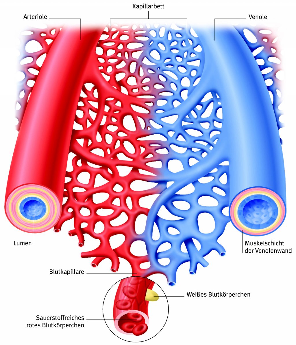 Das Kapillarbett besteht aus einem weitläufigen Blutkapillarnetz, das Arterien und Venen miteinander verbindet. Sauerstoff und Nährstoffe können zur Versorgung der Organe die Wände der Blutkapillaren durchdringen. Das Abfallprodukt Kohlendioxid kann vom Gewebe aus zurück in die Kapillaren gelangen und danach über die Lungen ausgeschieden werden.
