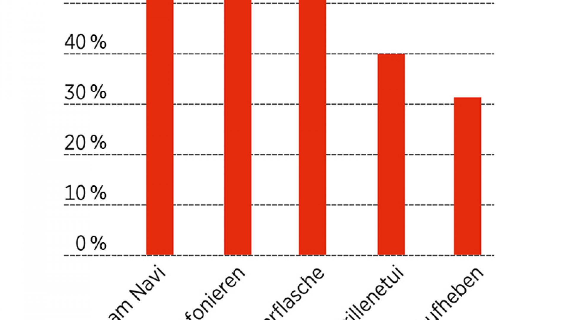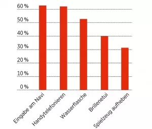 Welche Tätigkeiten beim Fahren wie stark ablenken, hat nun der ADAC in einem Experiment getestet. Im ersten Versuch testeten sie, wie lange Probanden abgelenkt waren, wenn sie verschiedenen Tätigkeiten beim Fahren ausführten. Dabei zeigte sich: Am meisten Aufmerksamkeit forderte das Eintippen einer Adresse in ein Navigationsgerät, gefolgt vom Telefonieren mit dem Handy und der Entnahme einer Brille aus dem Etui. Nur kurz schweifte der Blick dagegen von der Fahrbahn ab, wenn die Testfahrer ein Spielzeug vom Boden aufhoben oder aus einer Wasserflasche tranken.