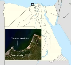 Den Überlieferungen zufolge lag die ägyptische Hafenstadt Thonis-Herakleion einst am westlichsten Arm des Nils, dem heute verlandeten Kanopus-Arm. Die von Kanälen durchzogene Stadt war in der Spätzeit der pharaonischen Ära Ägyptens wichtigste Verbindung zum Mittelmeer und einer der größten Häfen im gesamten Mittelmeerraum. Herakleion war jedoch auch von großer religiöser Bedeutung: In ihr lag ein wichtiger Tempel des Amun-Gereb, einer Variante der ägyptischen Haupt-Gottheit.