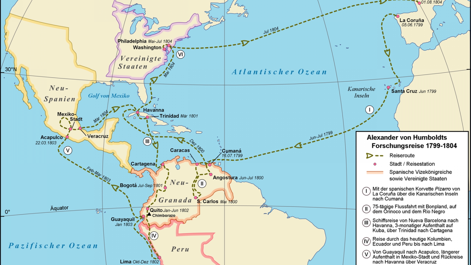 Am 5. Juni 1799 brechen Alexander von Humboldt und Aimé Bonpland in Richtung Südamerika in See. Mit im Gepäck: Messinstrumente, Nachschlagewerke und persönliche Vorstudien. In den folgenden Jahren wird Humboldt bis dato unbekannte Pflanzen und Tiere zeichnen, die Elektrizität von Zitteraalen untersuchen, hydrologische Messungen am Orinoco-Strom durchführen, das Lianen-Gift Curare am eigenen Leib testen und vieles mehr.