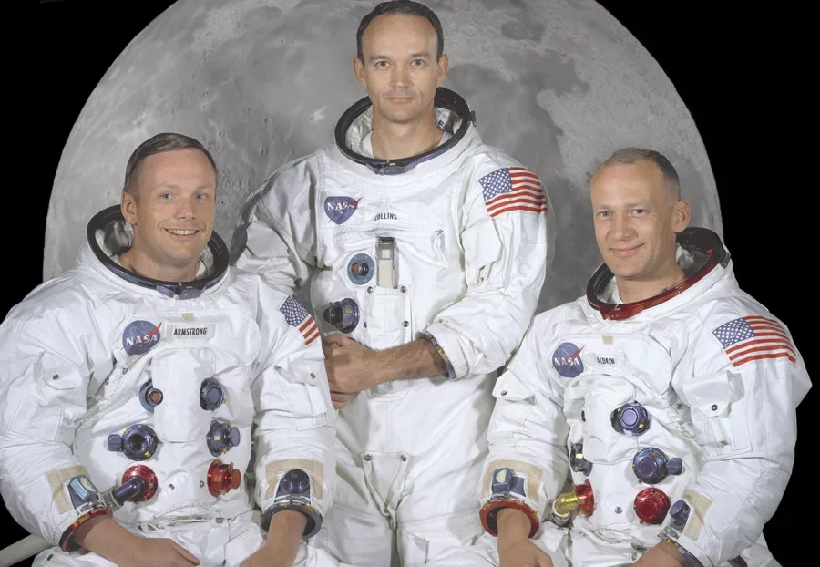 Die Apollo-11-Crew vor der erfolgreichen Mission: v. l. n. r. Neil Armstrong, Michael Collins, Buzz Aldrin.