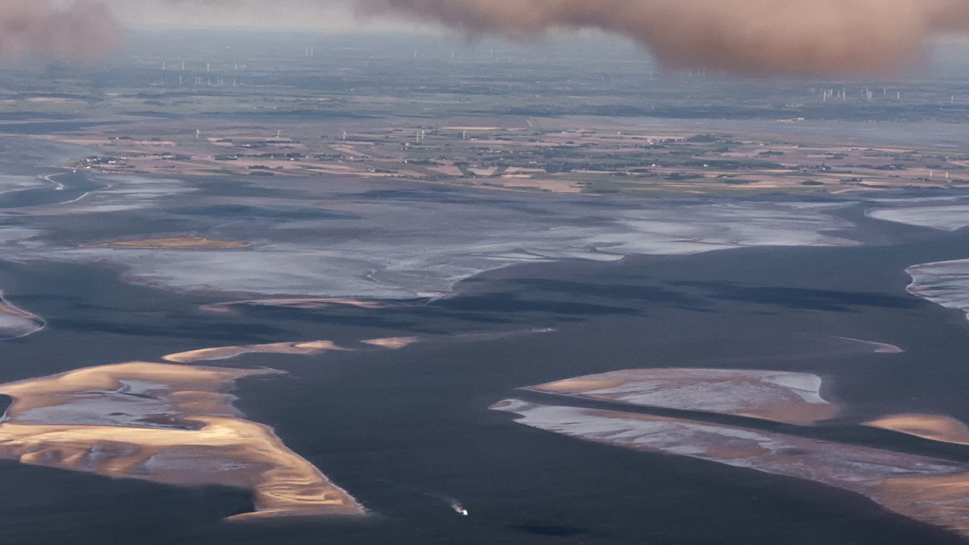 Blick über das nordfriesische Wattenmeer mit Südfall und Nordstrand, genau in der Bildmitte liegen die Überreste von Rungholt.licenses/by-sa/3.0/deed.en