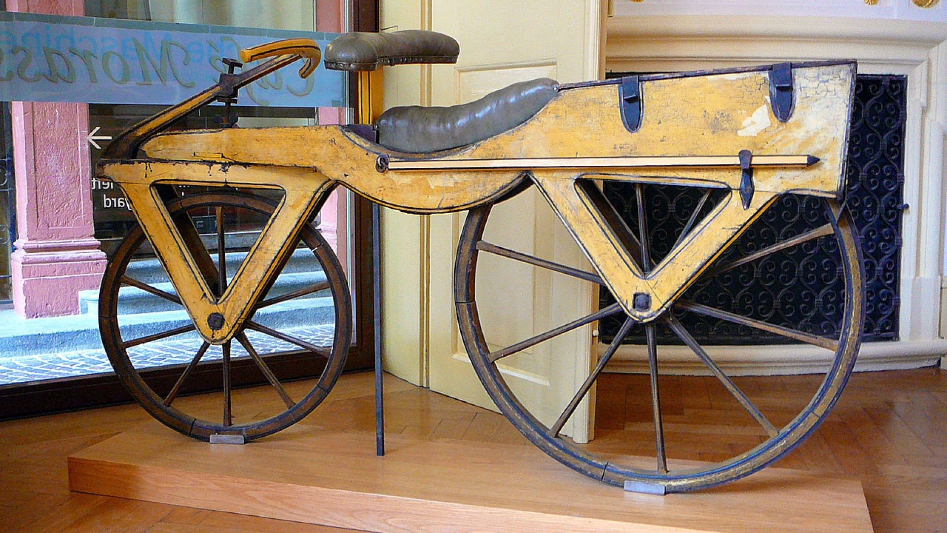 Das erste Fahrrad war eigentlich noch kein Fahrrad. Vélocipède - Schnellläufer - nannte der badische Forstlehrer Karl Drais 1817 seine Erfindung. Später wurde die ‚Laufmaschine‘ zu seinen Ehren in Draisine umbenannt. Karl Drais' lenkbare Laufräder waren noch überwiegend aus Holz und ohne Luftreifen. Der „Fahrer“ musste gleichzeitig mit den Füßen für Antrieb sorgen und die Balance halten. Doch auf ebener Fläche erreichten die Laufräder eine Geschwindigkeit von etwa 15 Stundenkilometern: immerhin schneller als eine Postkutsche.