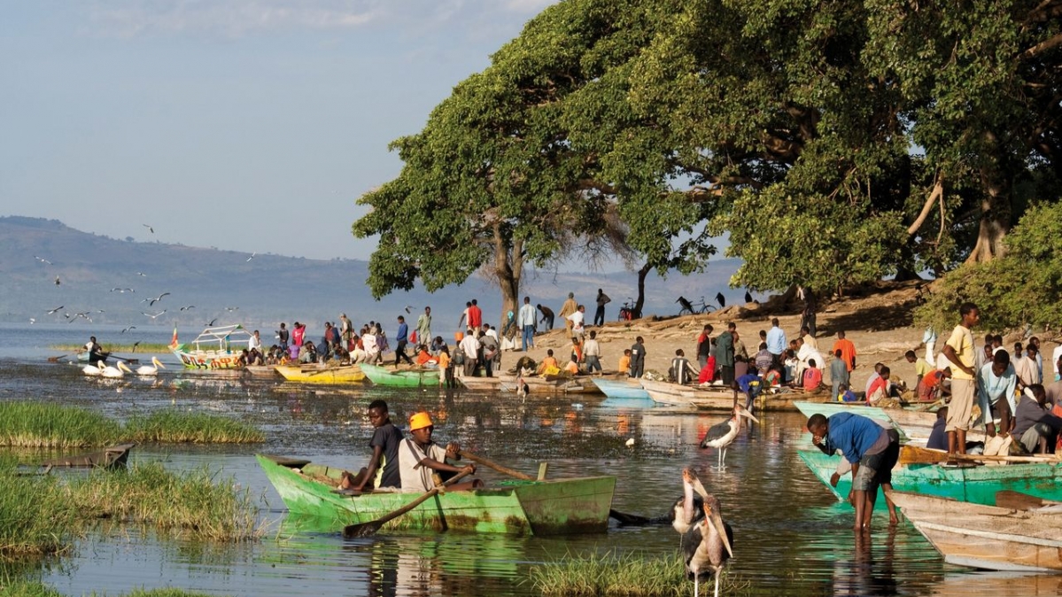 Geschäftiges Treiben beim Fischmarkt am Ufer des Awassa-Sees. Der Awassa-See ist einer der kleinen Seen des ostafrikanischen Grabenbruchs und bietet wegen seines Fischreichtums einer Vielzahl von Wasservögeln ein ideales Revier.