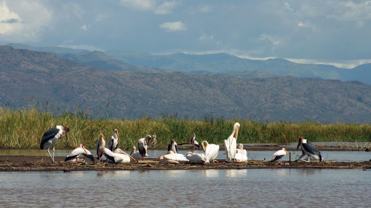 Pelikane und Reiher halten am Chamo-See Ausschau nach Beute. Für Ornithologen ist Äthiopien ein Paradies. Hier leben u .a. Rallen, Störche, Eisvögel, Limikolen oder Klunkeribisse.
