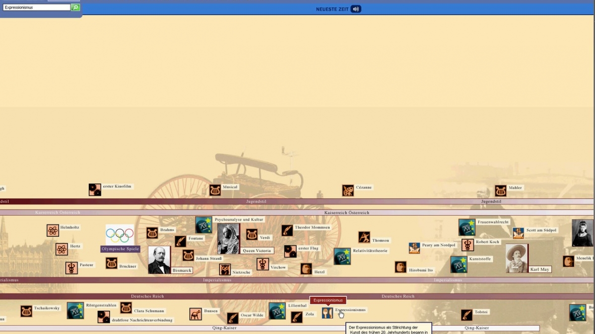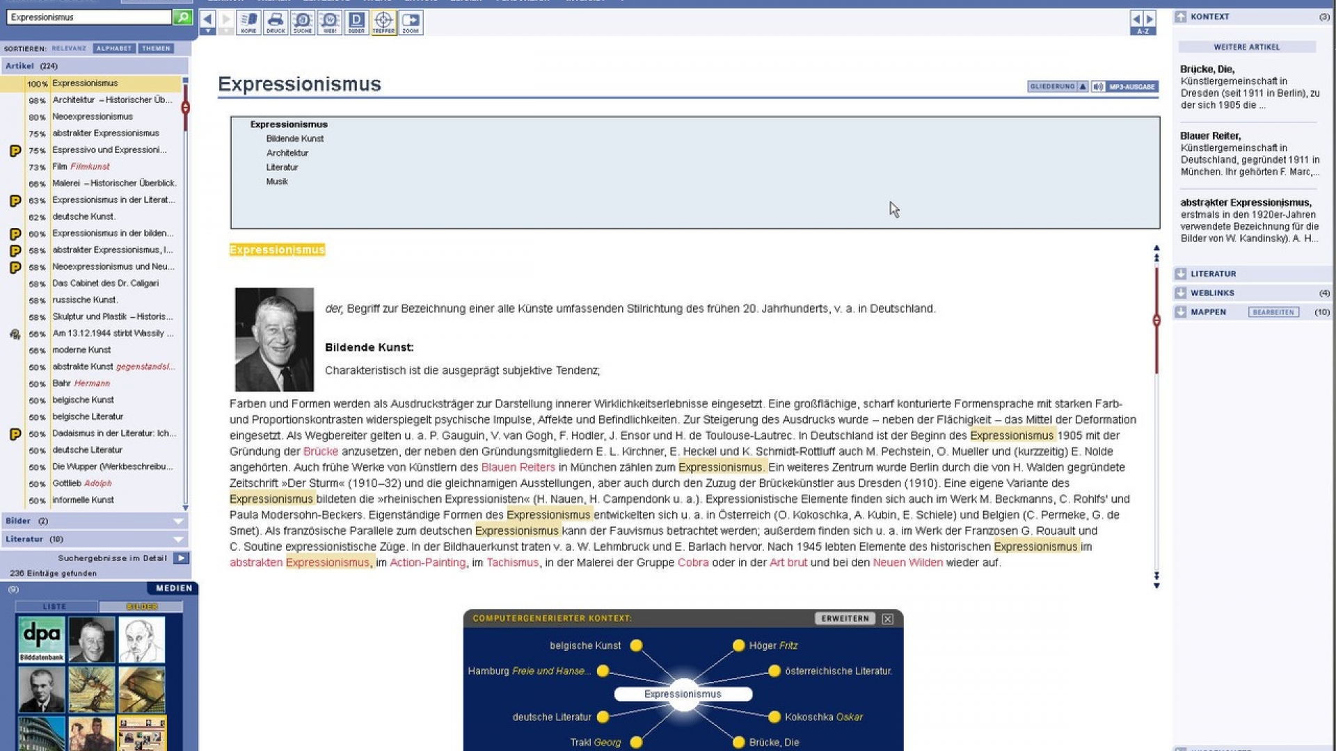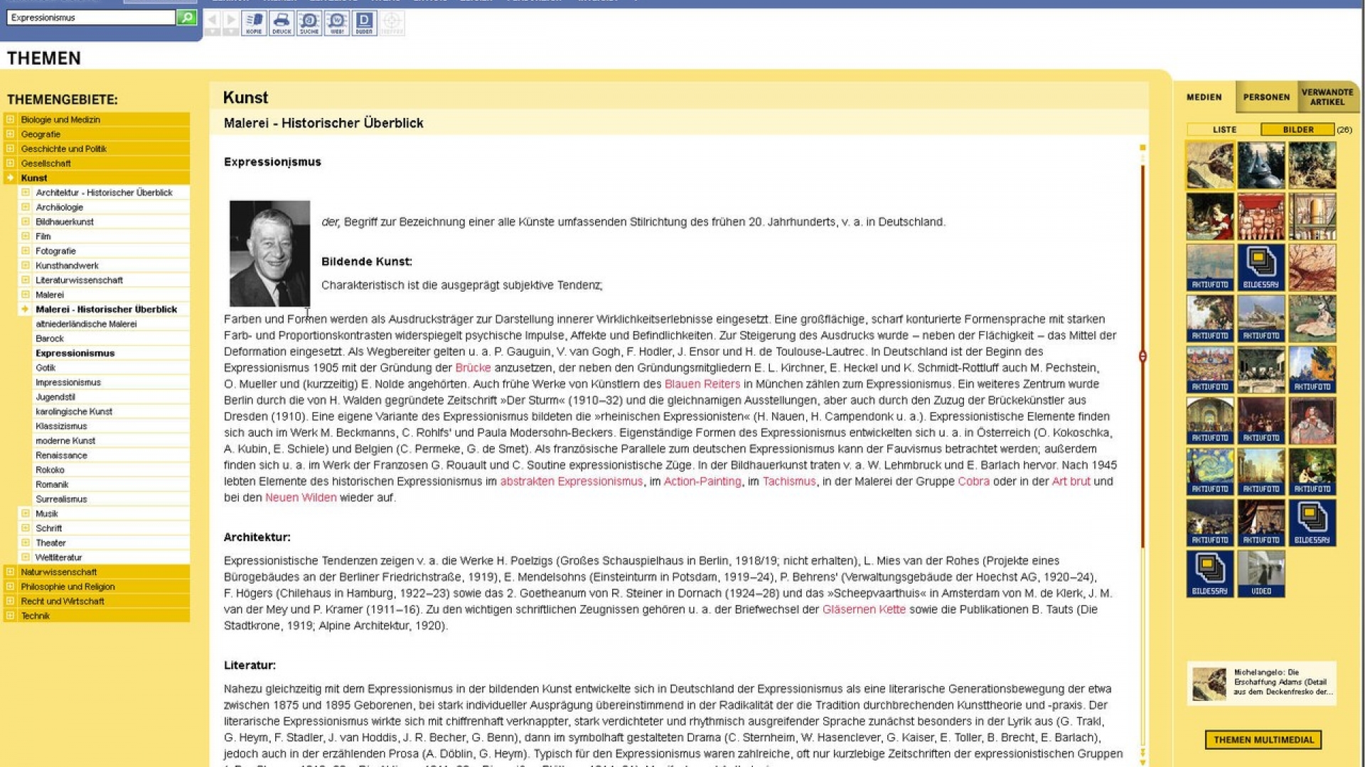 Biologie, Medizin, Geographie, Gesellschaft, Geschichte, Politik, Naturwissenschaften - die Liste der Themengebiete des Brockhaus Multimedial ist lang. Und natürlich gehört auch das Gebiet der Malerei dazu. Über "Malerei - historischer Überblick" gelangt man dann zu den Stilrichtungen, darunter - der Expressionismus. Doch nicht nur die expressionistisceh Malerei wird hier behandelt, sondern auch seine Auswirkungen Architektur, Musik und Literatur.Hier Brockhaus multimedial bestellen