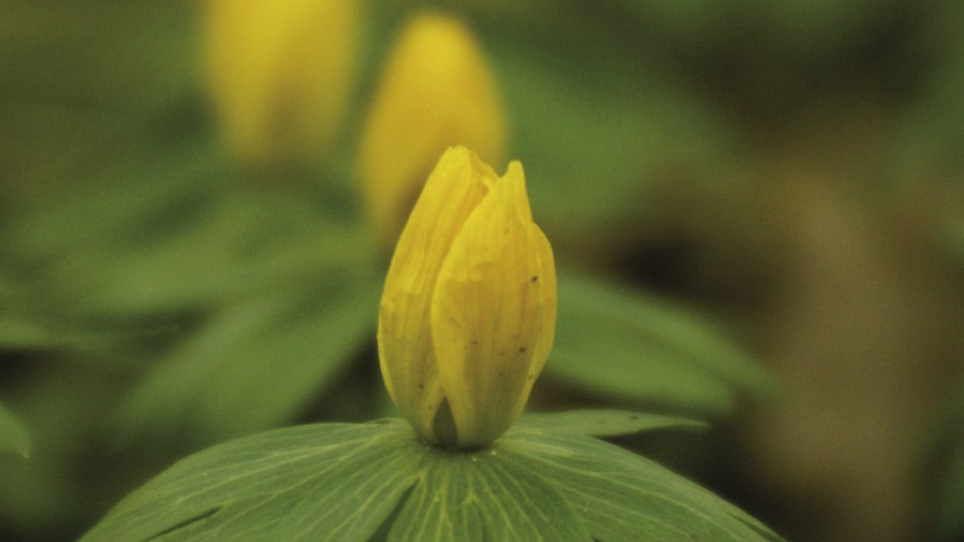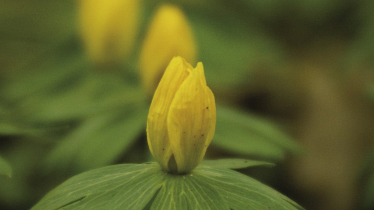 Die gelbe Blüte des Buschwindröschens thront auf dem grünen Blätterreif. Hier treffen Heiterkeit (Gelb) auf Harmonie (Grün). Ein schöner Neubeginn im Frühling.