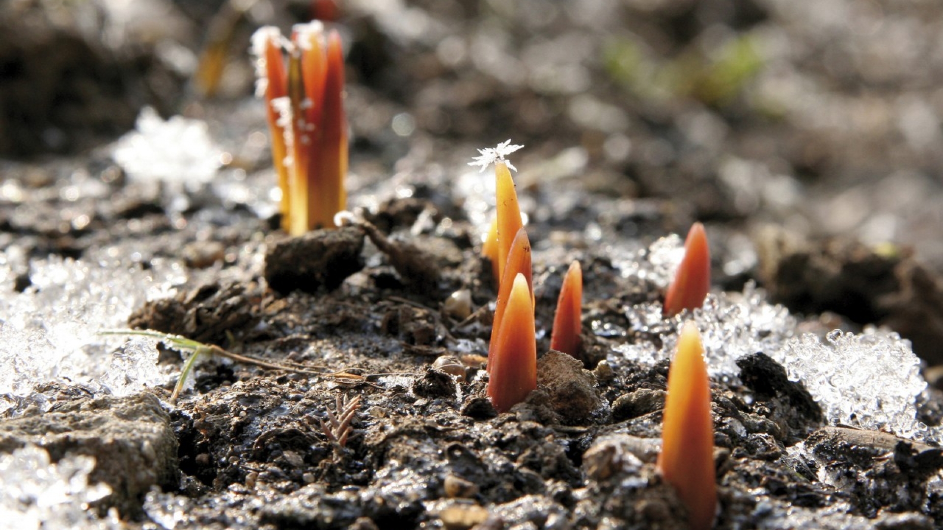 Orangefarbene Tulpenknospen sprießen aus dem noch kalten Boden. Tulpen in dieser Farbe haben folgende Bedeutung: Du faszinierst mich. Wobei hier die Frage aufkommt, wer wen fasziniert, die Tulpe den Betrachter oder umgekehrt.