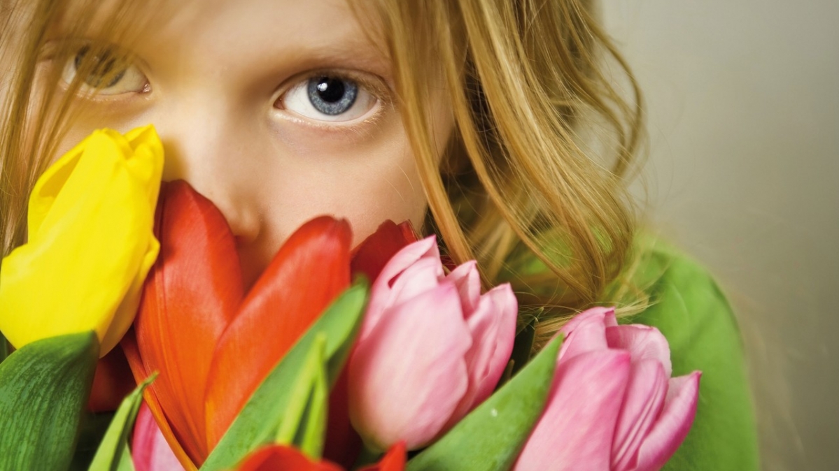 Fasziniert vom Tulpenduft steckt das Mädchen ihre Nase in den Blumenstrauß. Möglich ist aber auch, dass es jemandem schöne Augen machen möchte. Zumindest ist das die Bedeutung eines bunten Tulpenstraußes.