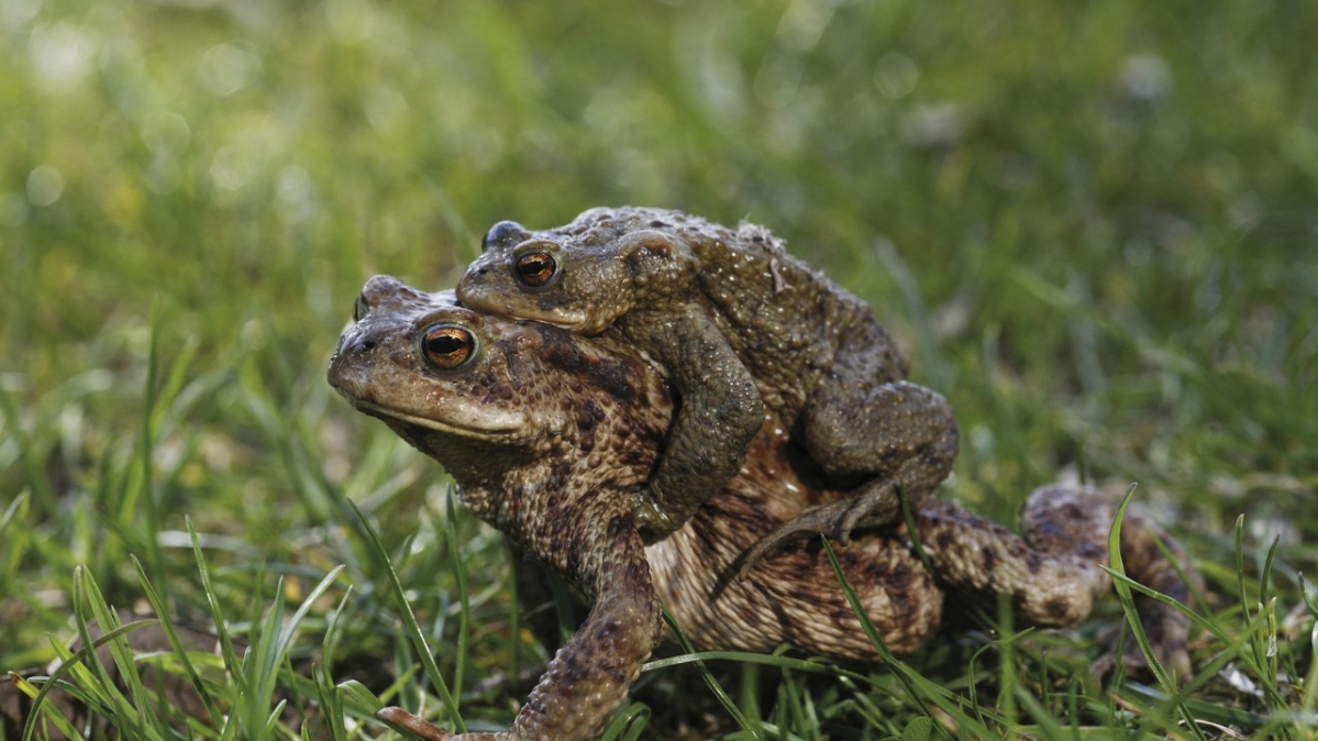 Im Frühjahr beginnt bei vielen Tieren die Paarungszeit. Hier pflegen zwei Erdkröten den Fortpflanzungsakt. Während Braun unter anderem für Ruhe steht, ist Grün die Farbe der Mitte, sie symbolisiert Neubeginn und Wachstum. Auf die Kröten bezogen: Zeugung und das Heranreifen des Nachwuchses.