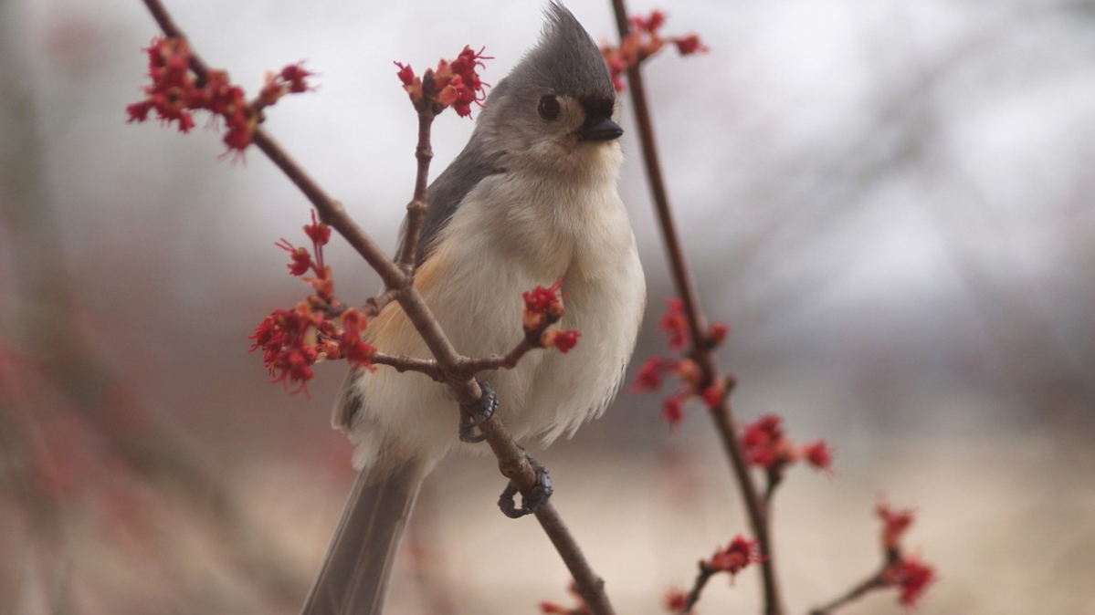 Auch wenn die Meise eine Punker-Frisur trägt, sie heißt Indianermeise. Hier hält sie Ausschau nach - wer weiß das schon?! Die roten Knospen geben dem sonst blassbraunen Hintergrund etwas Kraftvolles. Rot steht für seelische Kraft, Entschlossenheit, Durchhaltevermögen und natürlich für Liebe.