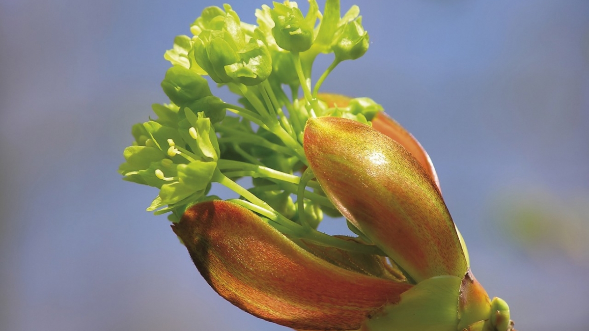 Der junge Trieb schaut wie aus einer Schnauze heraus. Ein helles Grün ist Zeichen für die Freude an der Natur.