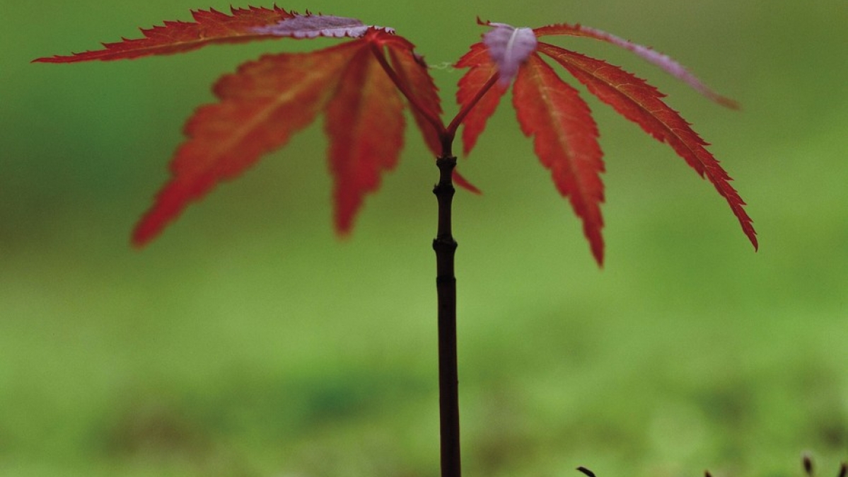 Klein und zart wächst ein Ahorn aus dem Moos. Der Ahorn ist das Symbol Kanadas.