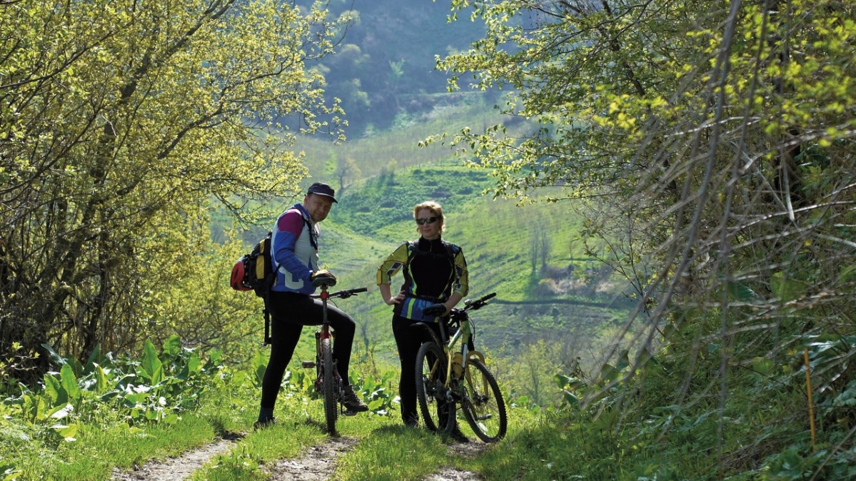 Ein Pärchen radelt durch Feld und Wald. In der Natur tankt man auf. Vor allem das Grün der Natur ist es, das auf den Menschen beruhigend wirkt. Die Farbe Grün kommt in der Natur sehr oft vor. Der Körper braucht offenbar diese Information zur Regeneration und zum Aufbau. Grün wirkt ausgleichend und hilft, die Mitte zu finden.