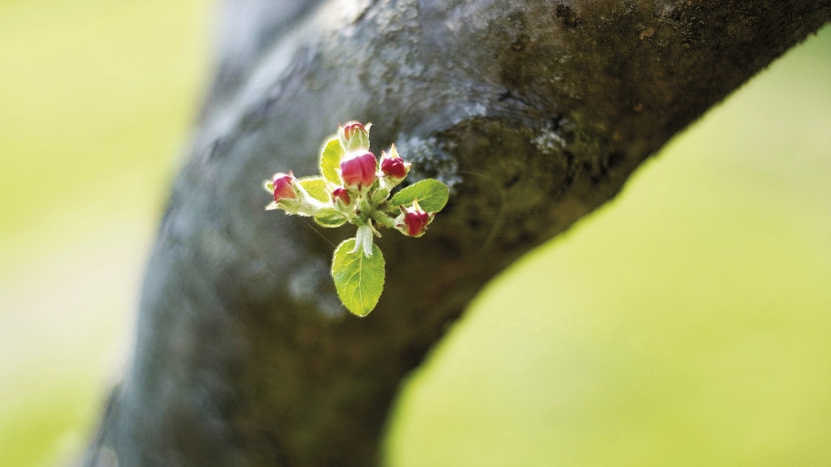 Aus einer Baumrinde bahnt sich ein Trieb seinen Weg in die Freiheit, klein und unaufdringlich - und ein bisschen romantisch. Sattes Rosa steht für tiefe und reife Liebe.