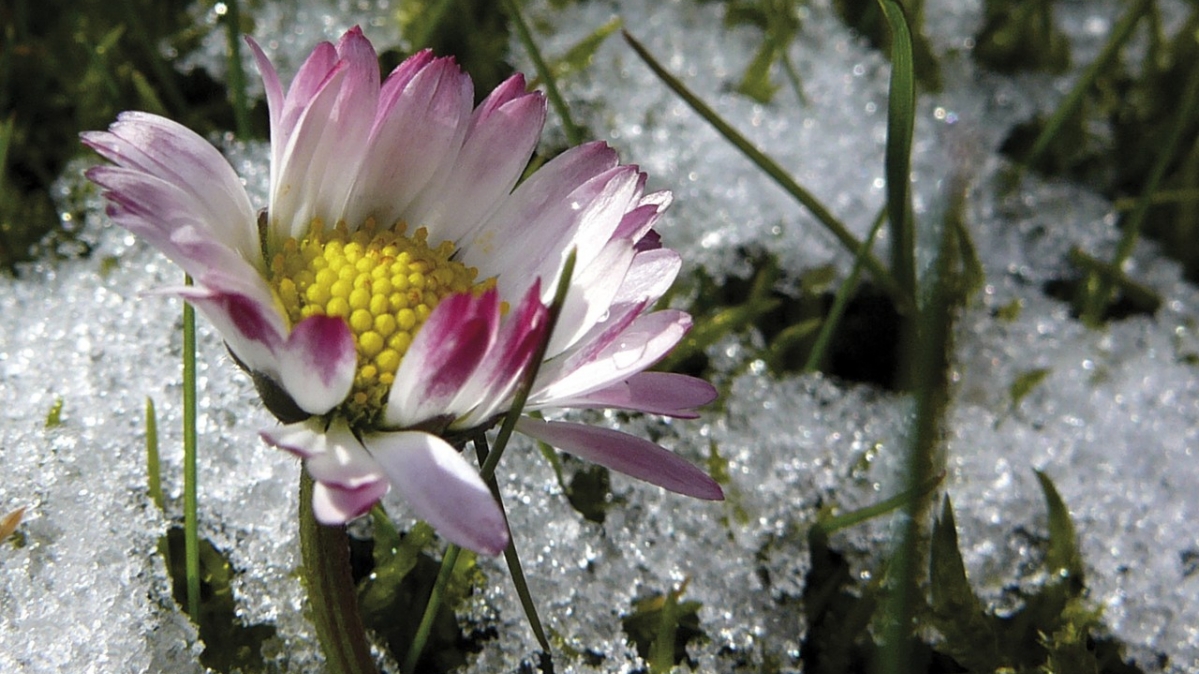 Diesem Gänseblümchen stellen sich die Härchen oder besser: die Blütenblätter auf. Es reckt sich der Sonne entgegen. Gänseblümchen sind Überlebenskünstler und stehen für Unschuld. Das Violett an den Blütenspitzen kontrastiert mit dem Weiß der Schneelandschaft. Violett ist eine mystische Farbe, steht aber zugleich für Entspannung und fördert den Schlaf.