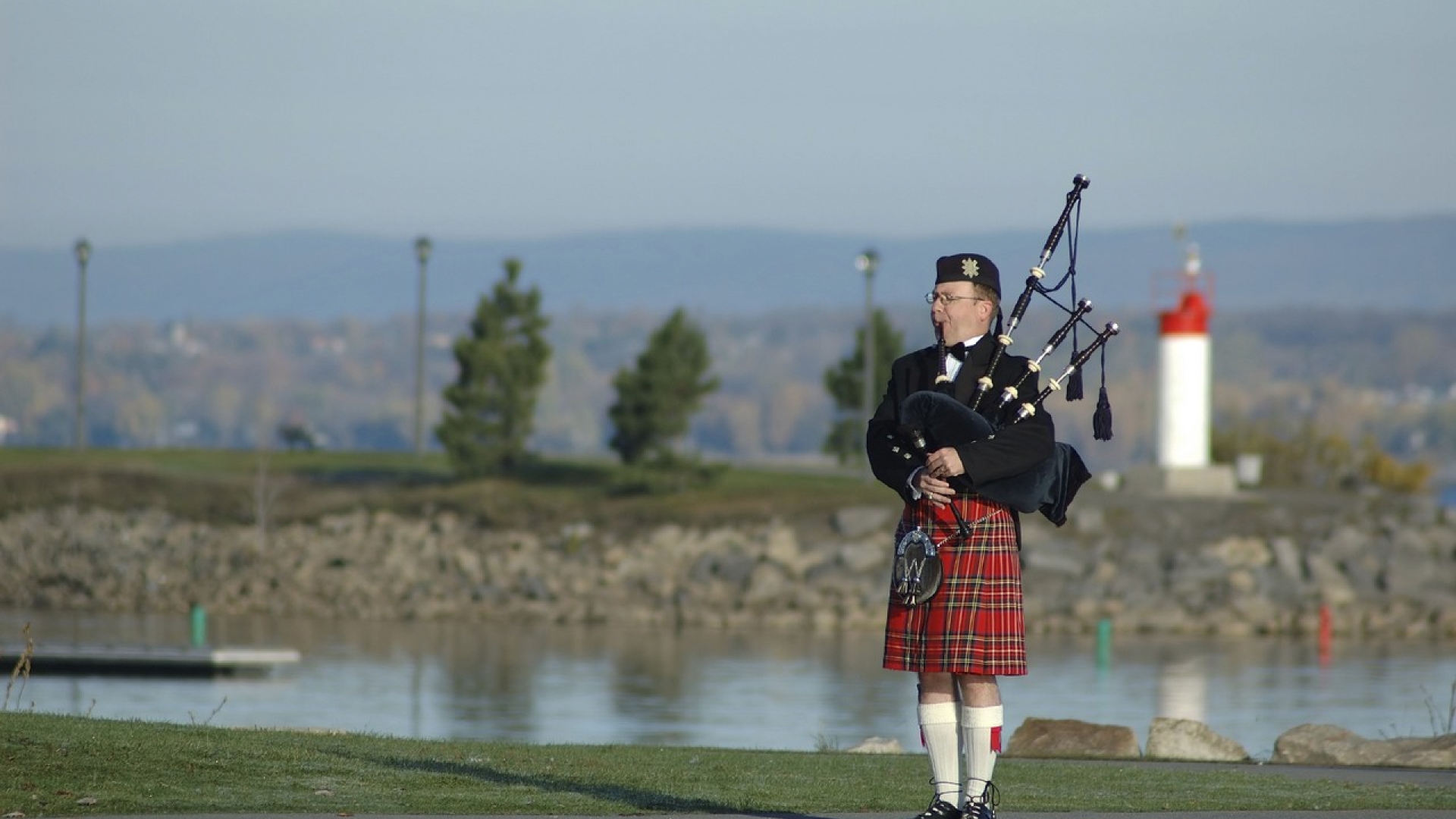Vor den Highlands spielt ein Schotte Dudelsack (Sackpfeife). Der wird nicht unmittelbar mit dem Mund angeblasen, sondern aus einem Ledersack mit Luft versorgt. Der Bläser füllt den Sack mit Atemluft und regelt den Luftdruck für die Schalmei durch Druck mit dem Arm. Sackpfeifen haben ein oder zwei mit Grifflöchern versehene Melodiepfeifen und 1-3 Stimmer, Brummer oder Bordunpfeifen, die Grundton und Quinte ständig mitklingen lassen. Die Sackpfeife ist asiatischen Ursprungs, heute schottisches Nationalinstrument.