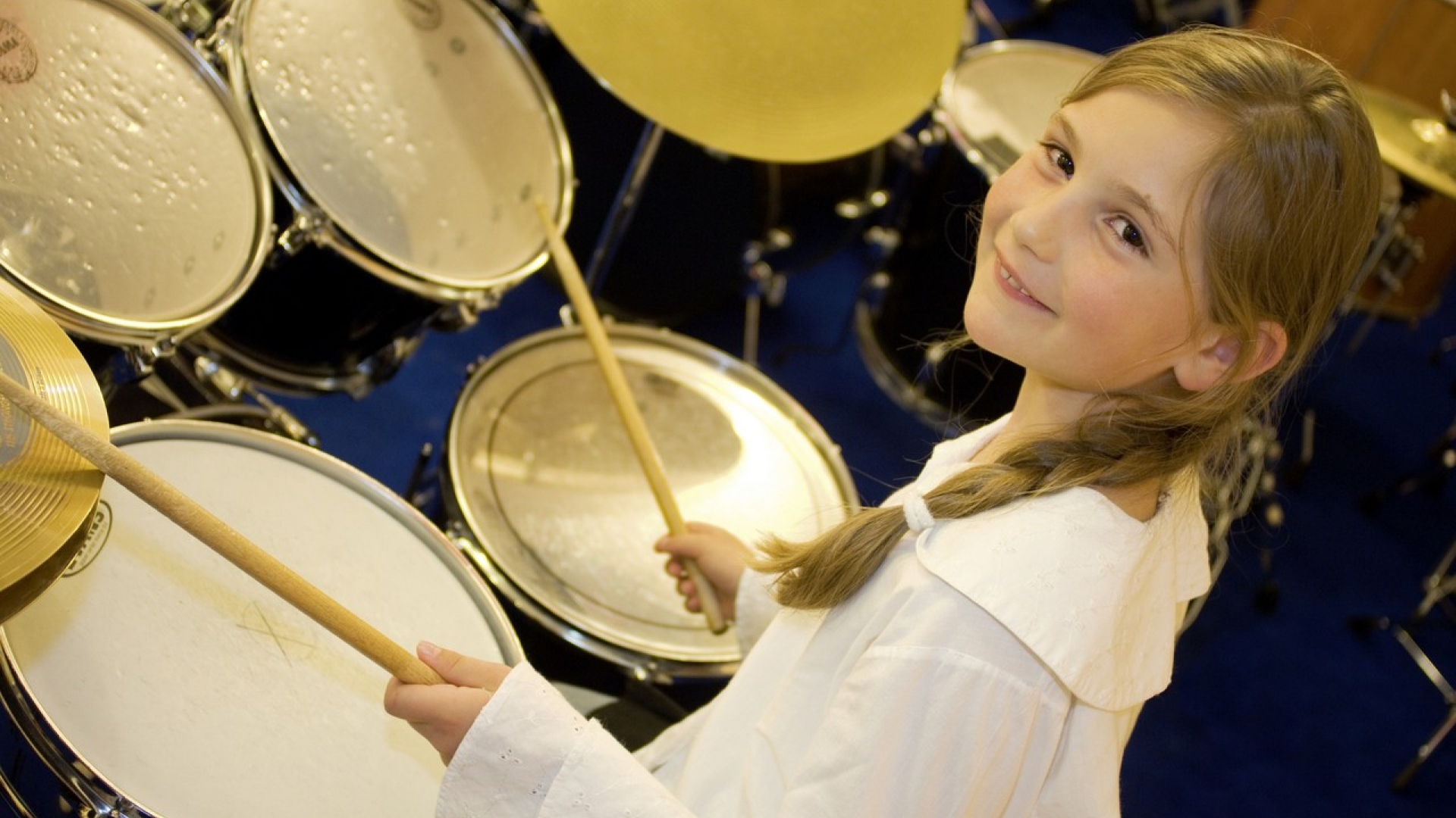 Ein Mädchen spielt Schlagzeug. Wichtig beim Schlagzeugspielen ist die Koordination von Armen und Beinen. Dabei geht es darum, verschiedene Handgriffe und Tricks zu lernen. Im Orchester spielen mehrere Musiker Schlagzeug, je nach Zahl der geforderten Instrumente. Im Jazz sowie im Rock- und Popbereich wird meist nur ein Schlagzeuger (Drummer) eingesetzt.