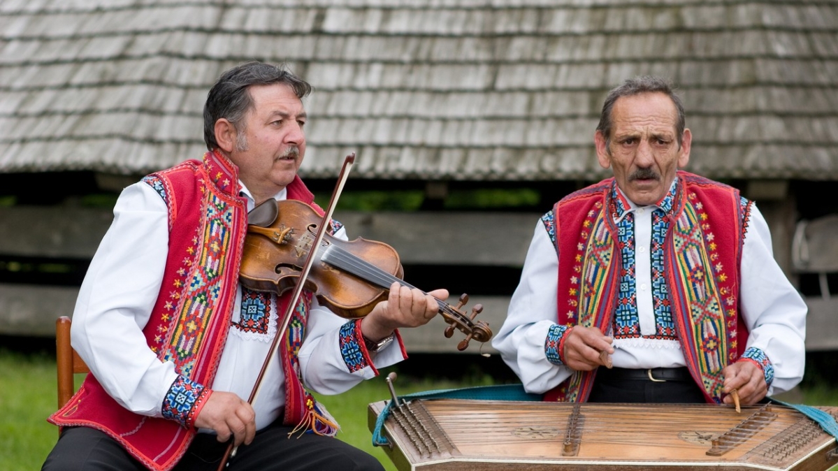 Ungarische Volksmusik mit Zither und Geige. Die Spieler tragen böhmische Trachten.