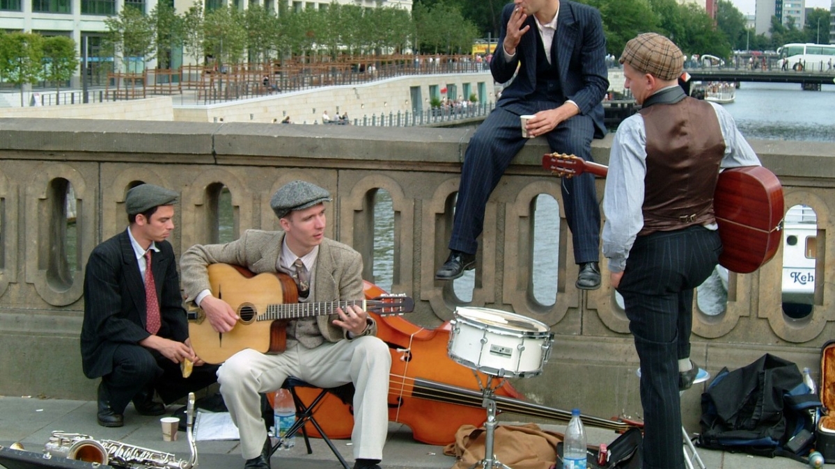 Mit Gitarre, Kontrabass, Trommel, Saxophon musizieren Straßenmusikanten an einer Brücke in Berlin.