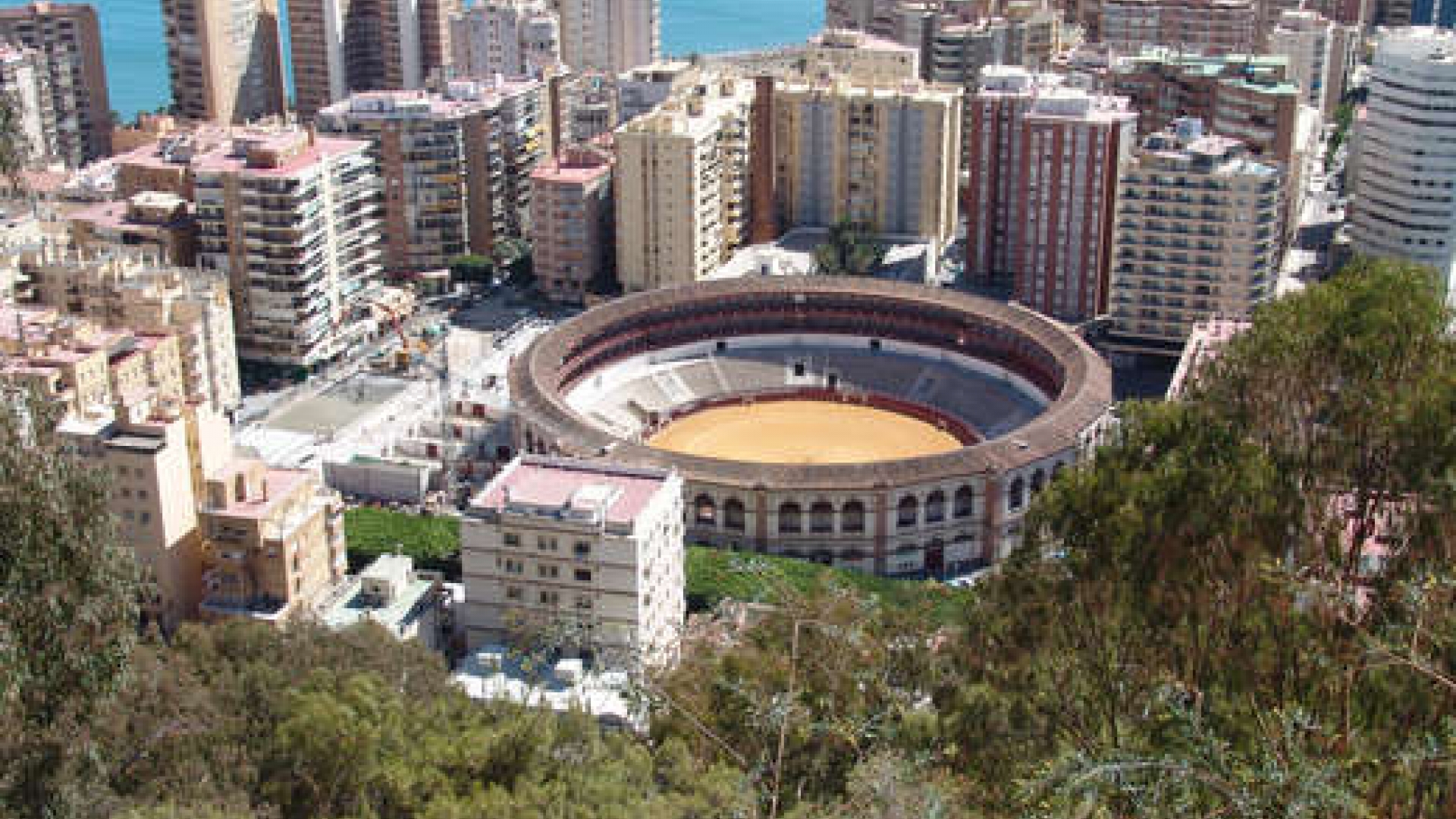 Blick auf die Neustadt von Málaga mit der traditionellen Stierkampfarena