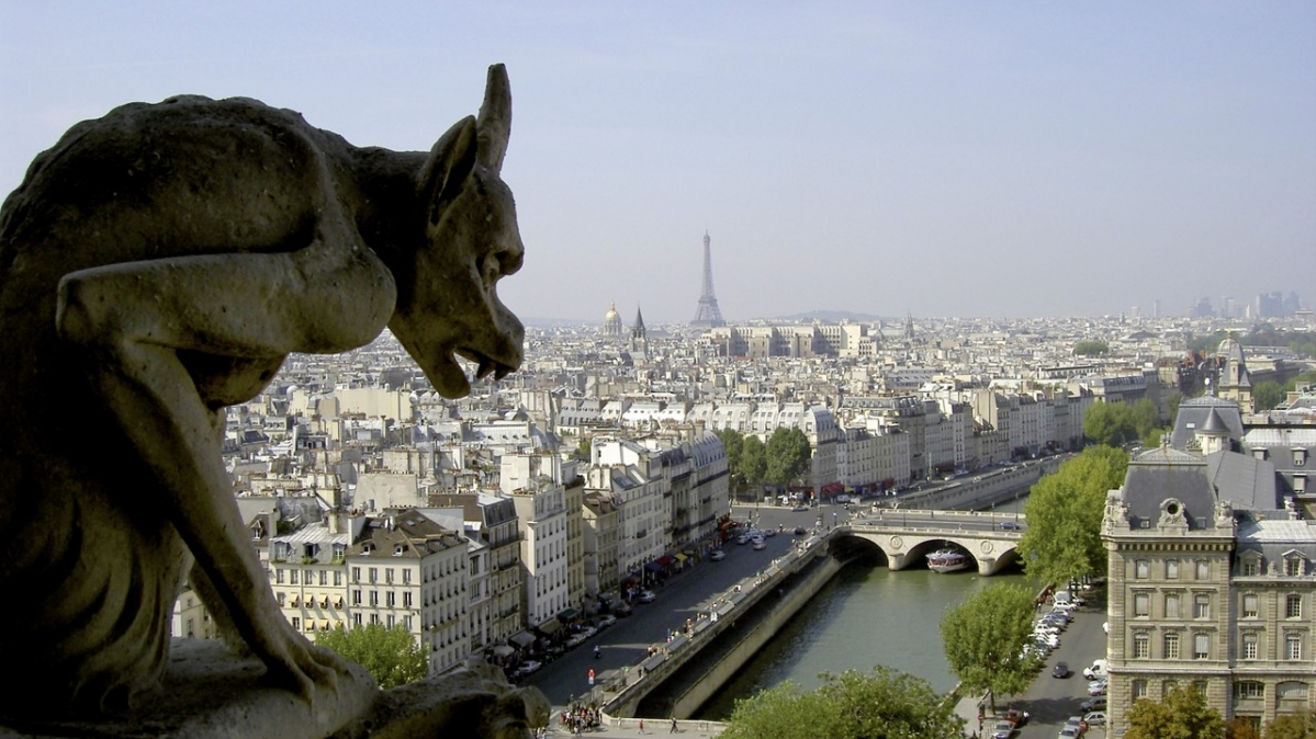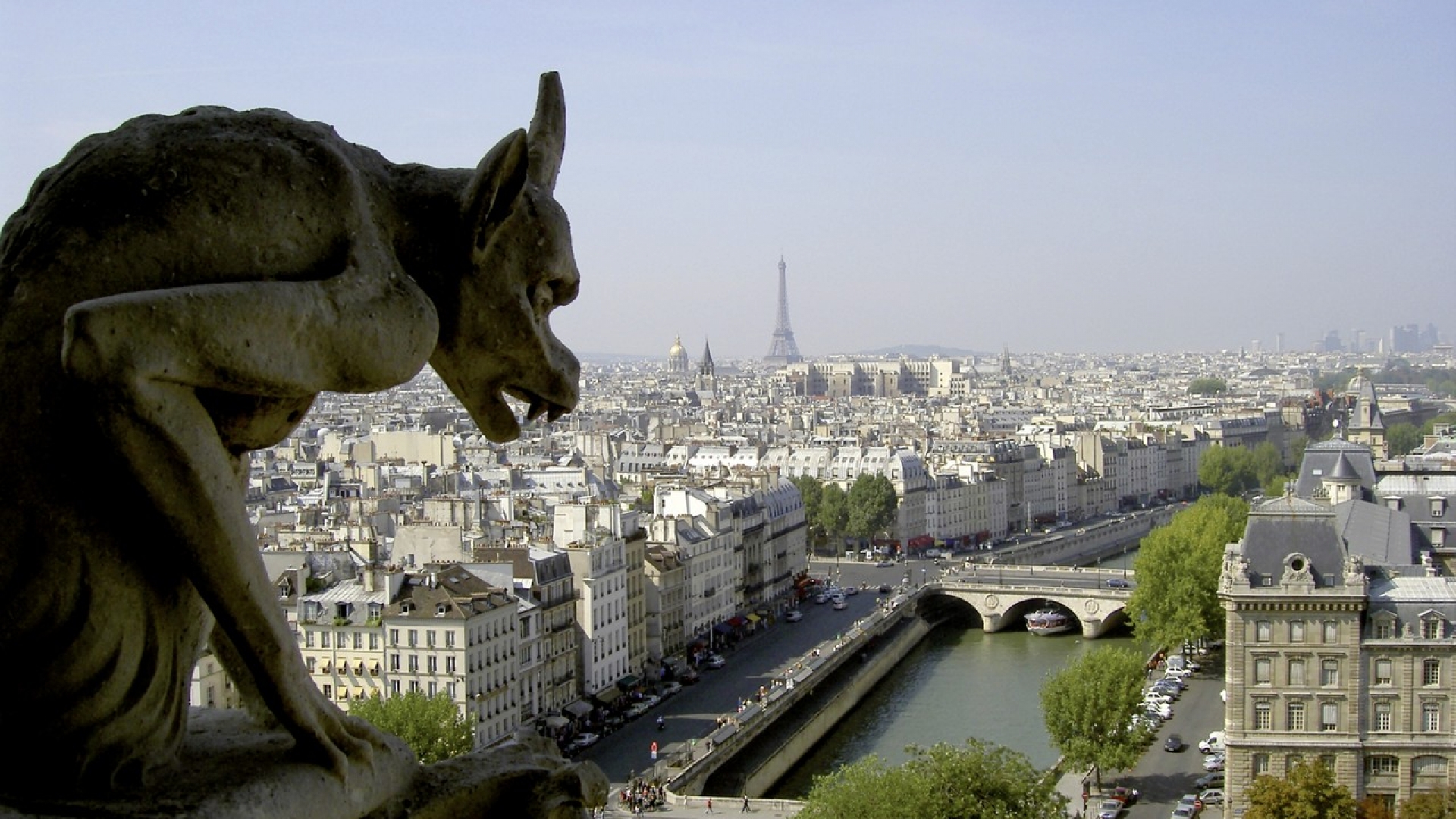 Ein gotischer Wasserspeier an der Kathedrale Notre Dame in Paris.
