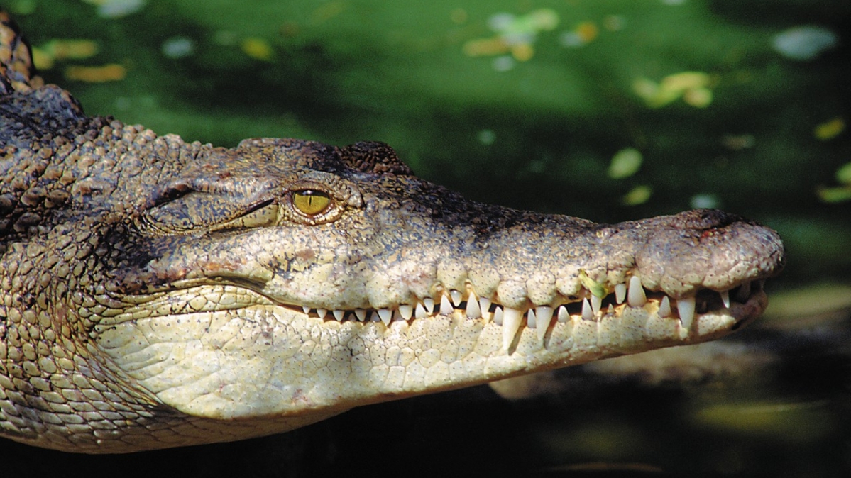 Krokodile schwimmen durch schlängelnde Bewegungen ihres langen, kräftigen, seitlich abgeflachten Ruderschwanzes, die kurzen Extremitäten werden dabei an den Körper angelegt. Der abgeflachte Kopf hat einen stark verlängerten Schnauzenteil, der in seinen Kiefern zahlreiche spitze Zähne trägt, mit denen die Beutetiere, Fische, Wasservögel und Säugetiere, die zur Tränke kommen, ergriffen werden. Getötet werden sie dann durch schnelle Körperdrehungen, durch die sie unter Wasser gedrückt werden.