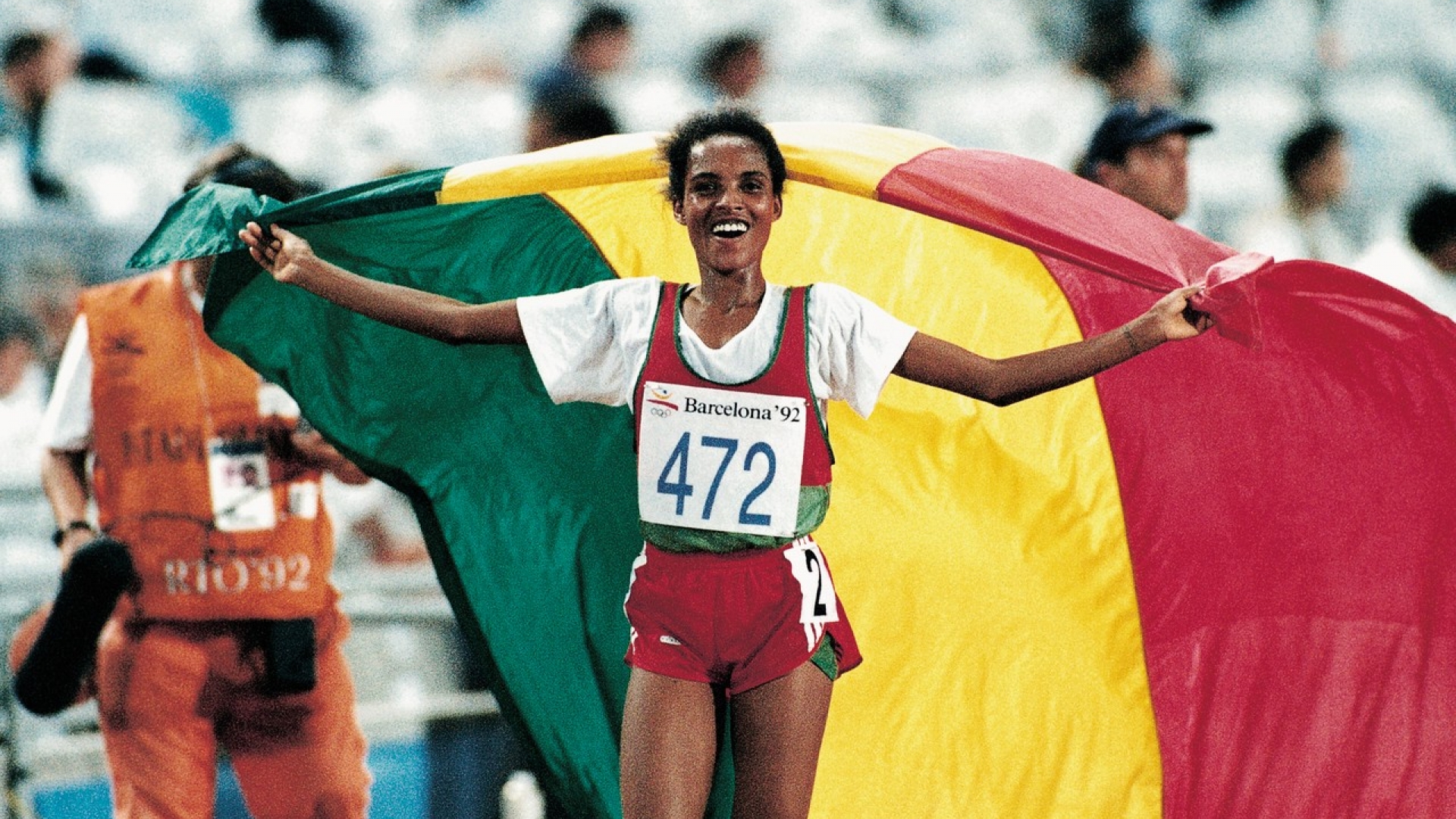 07.08.1992 / Barcelona, SpanienDerartu Tulu aus Äthiopien trägt die Nationalflagge, nachdem sie den 1000 m Endlauf der XXV. Olympischen Spiele gewann.