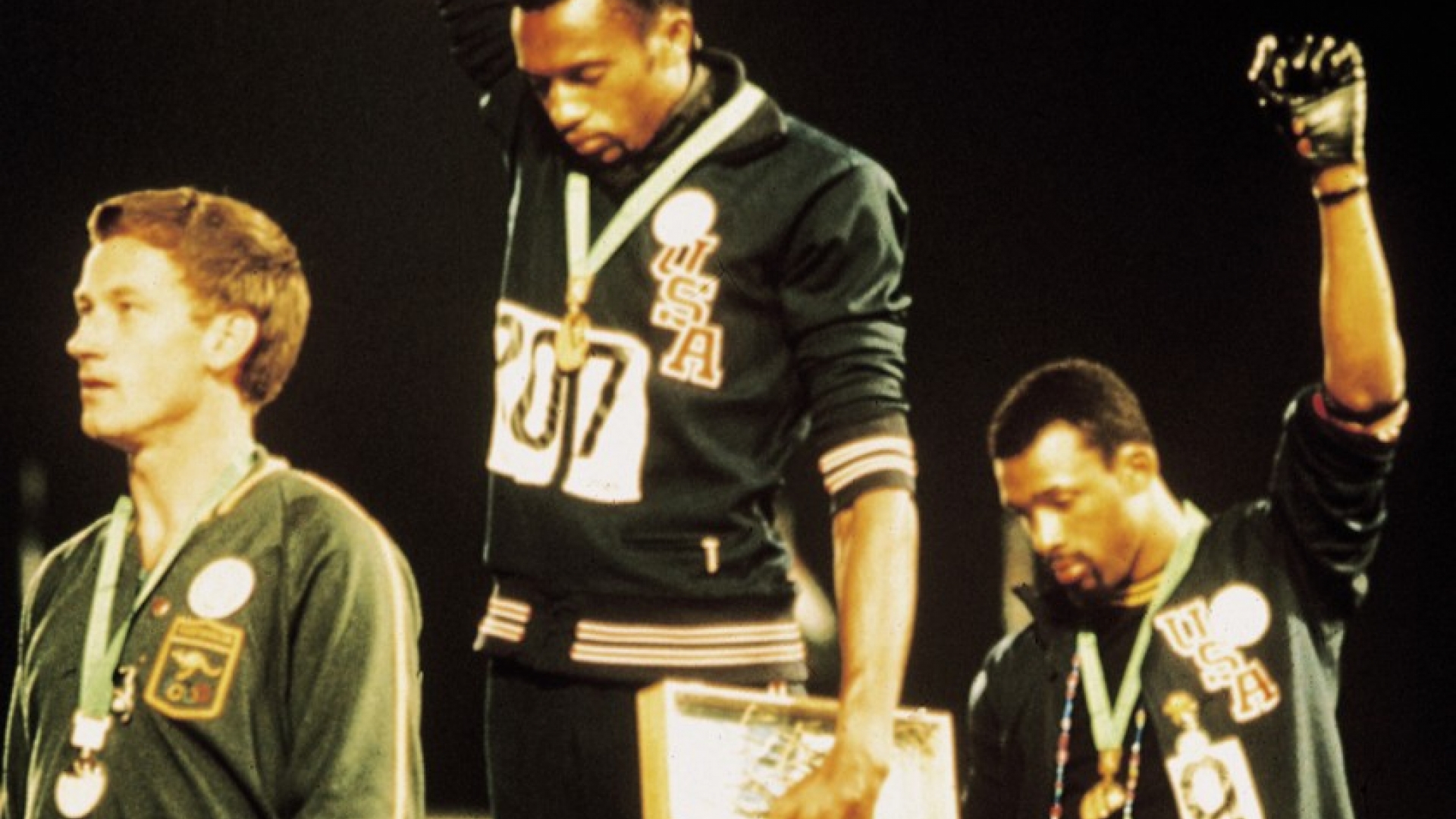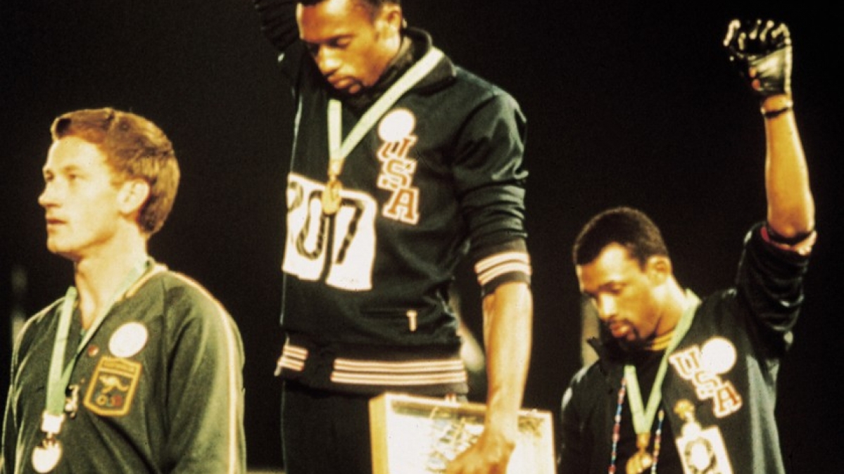 16.10.1968 / Mexiko StadtDie US-Athleten Tom Smith und John Carlos erheben bei der Siegerehrung ihre schwarz behandschuhten Hände zum "Black Power"-Zeichen.