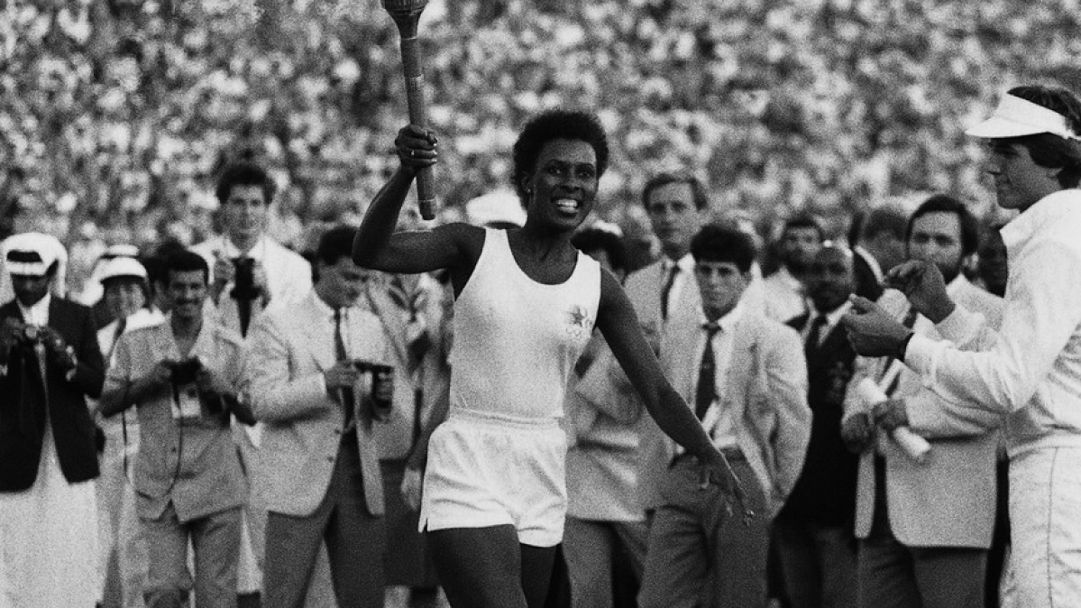 28.07.1984 / Los Angeles, USAGina Hemphill, Enkelin von Jesse Owens, trägt die Olympische Fackel in das Los Angeles Coliseum.