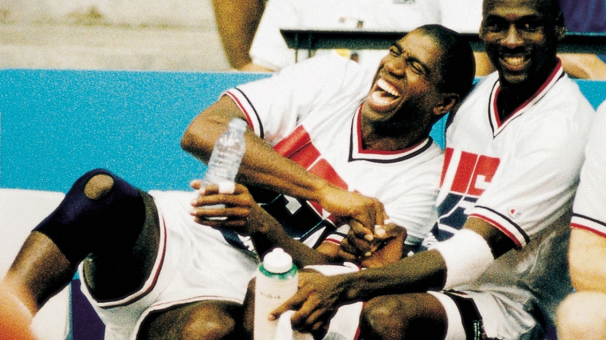 06.08.1992 / Olympische Sommerspiele, BarcelonaSemi-Finale im Basketball. Die Spieler Magic Johnson (links) und Michael Jordan sitzen auf der Reservebank. Die USA schlugen Litauen mit 127:76.