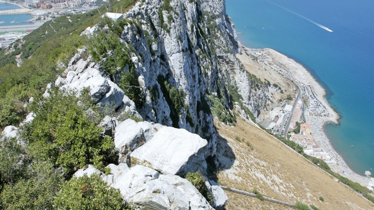 Blick auf die Ostseite von Gibraltar des " Upper Rock ". Britisches Überseegebiet an der Südspitze der iberischen Halbinsel, Hier springen in der Anfangsszene von "Der Hauch des Todes" (1987) englische Agenten ab, um die Sicherheit der Anlage zu testen.