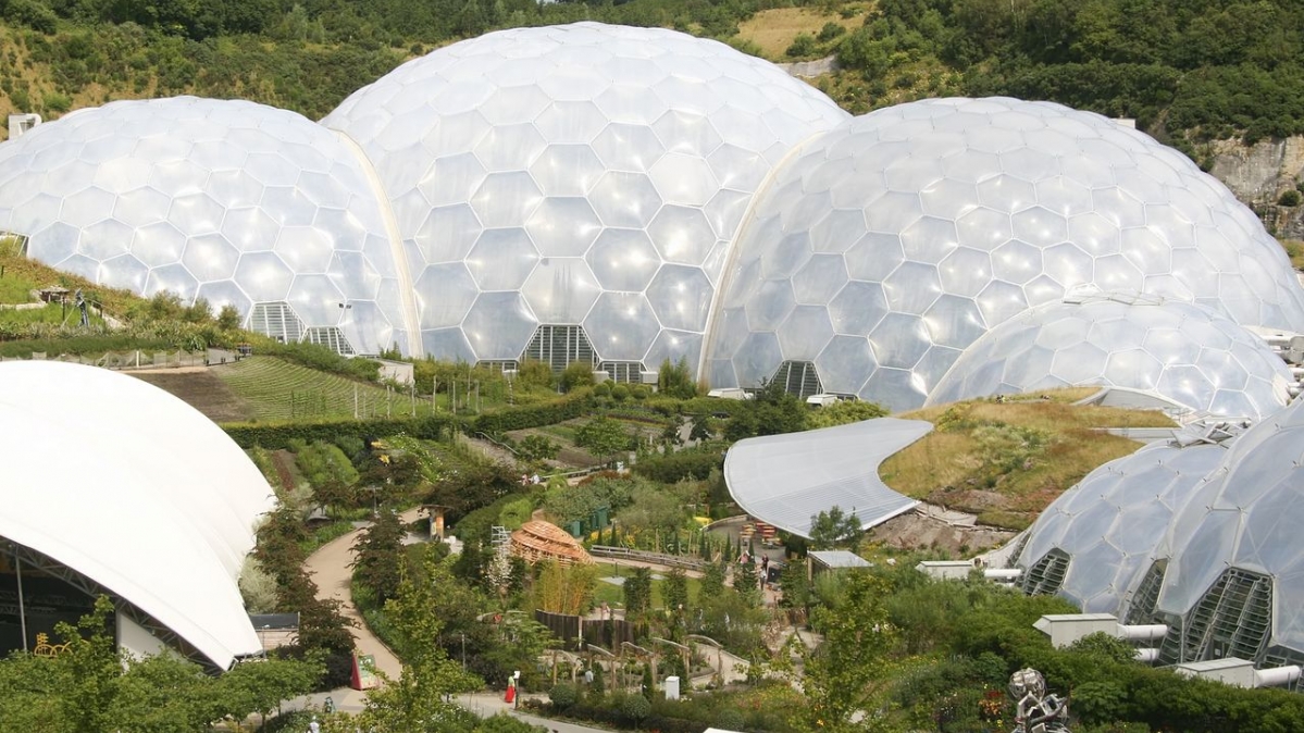 Buckminster-Fuller-Kuppeln des Eden Projects in Cornwall. Das Eden Project ist ein sehr bekannter, noch junger botanischer Garten bei Bodelva in Cornwall, England, nordöstlich von St. Austell. Es diente als Filmkulisse für den Bond-Streifen "Stirb an einem anderen Tag" (2002)