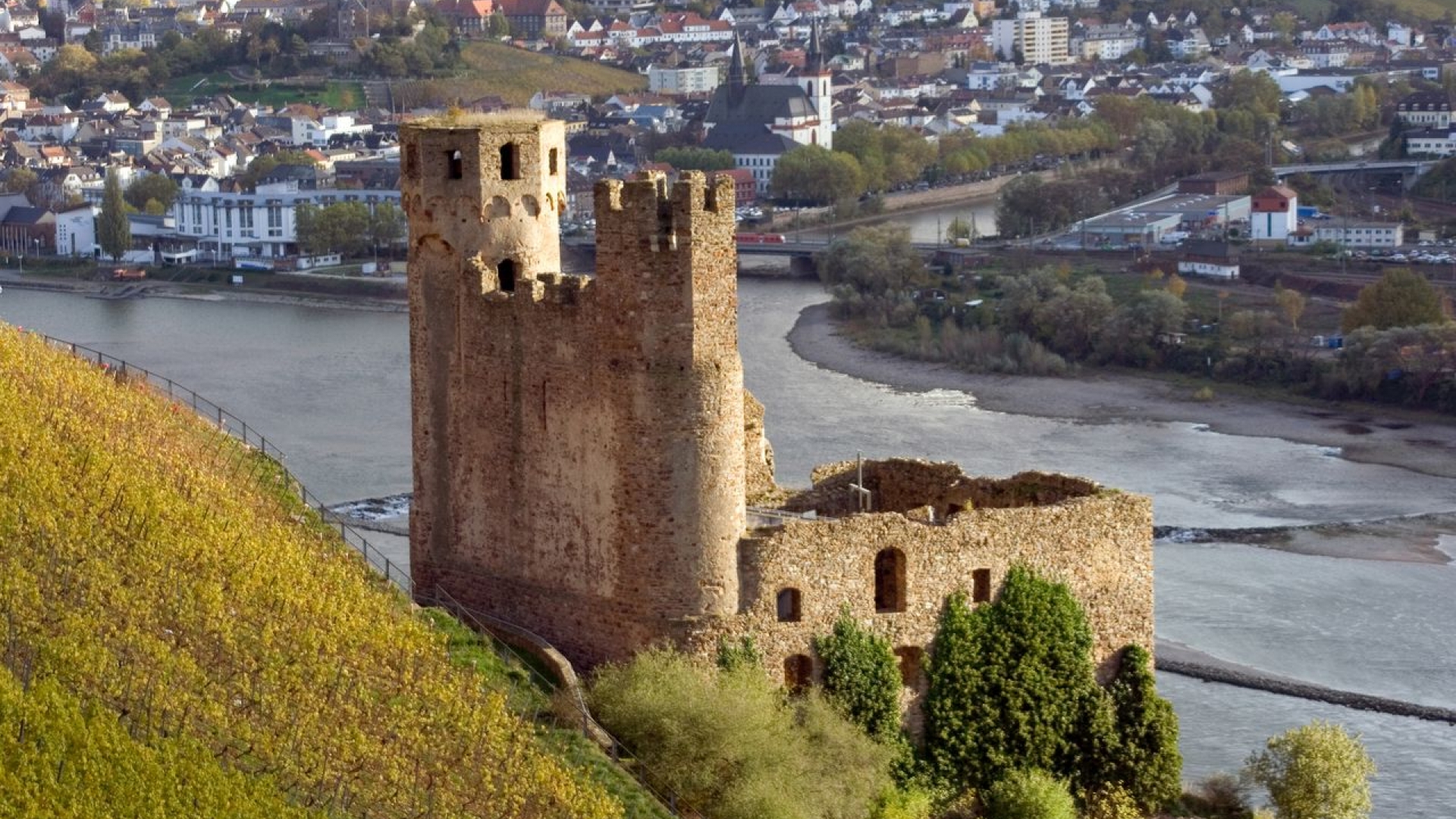 Die Burg Ehrenfels stammt aus dem 13. Jahrhundert. Sie steht am Hang des Rüdesheimer Berges am östlichen Rheinufer. Dahinter liegt die Stadt Rüdesheim im hessischen Rheingau-Taunus-Kreis. Rüdesheim hat 10.000 Einwohner. Markenzeichen der Stadt: Weinbau und -handel, Weinbrennereien, Sektkellereien.