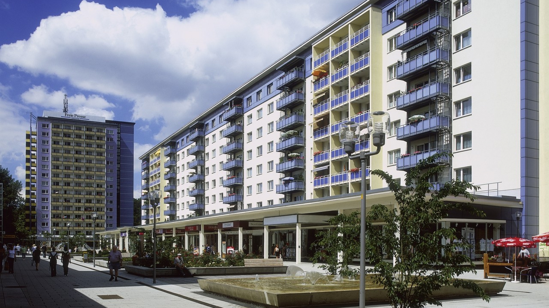 Eine Großwohnsiedlung in Chemnitz (Sachsen) - so genannte Plattenbauten. Plattenbauten sind vorwiegend aus Betonfertigteilen erbaute Gebäude - eine Art aneinandergereihte Fertighäuser.