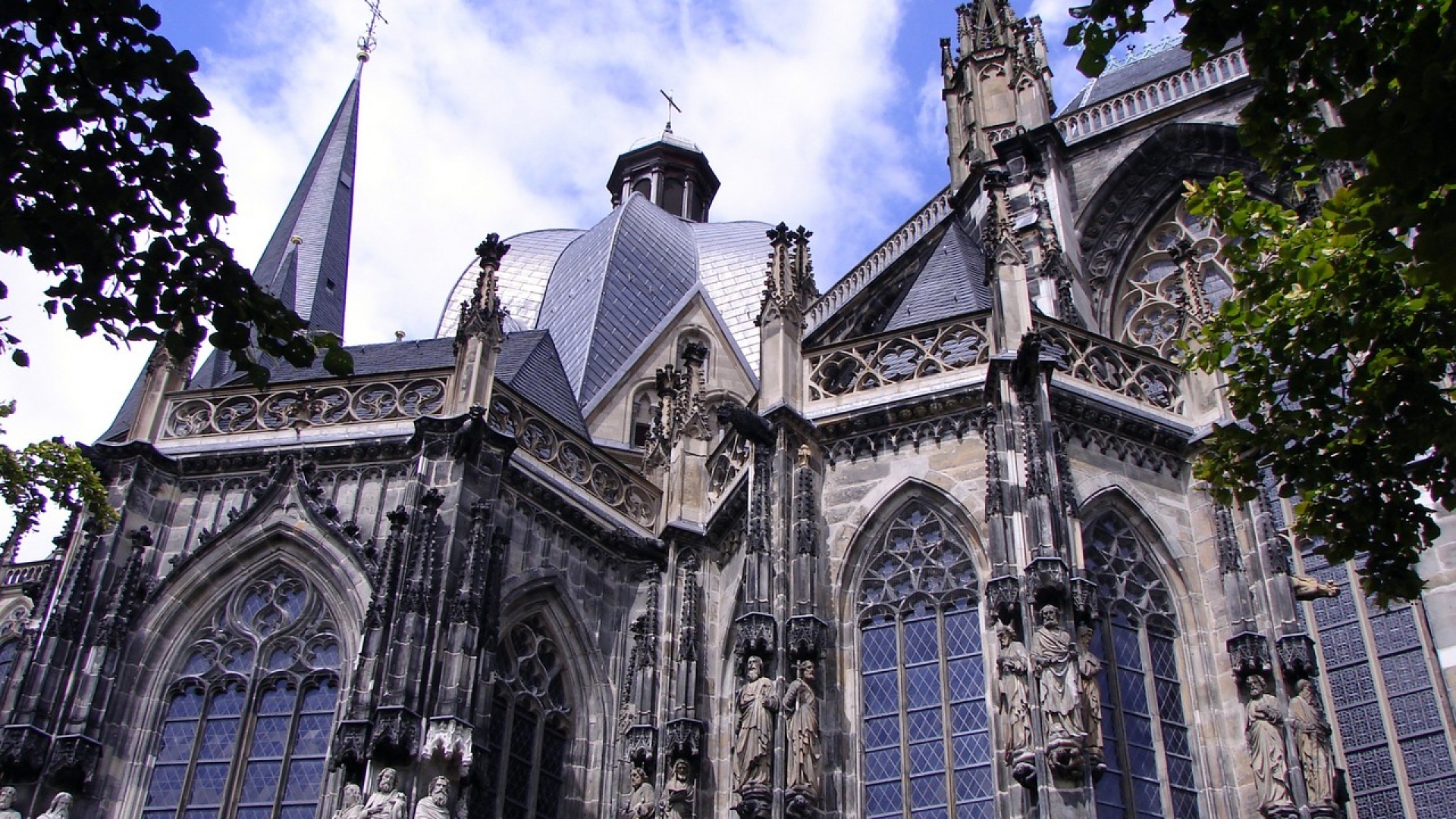 Der Aachener Dom, auch Aachener Münster oder Kaiserdom, ist die Bischofskirche des 1929 neu gegründeten Bistums Bistums Aachen und gehört zum Weltkulturerbe der UNESCO. Zum Dom gehören die Pfalzkapelle Karls des Großen (von Odo von Metz um 792-805 erbaut) und spätere Anbauten. Der ursprüngliche Bau ist ein oktogonaler Zentralbau mit doppelgeschossigem Umgang und Kuppelwölbung. Der Westbau enthielt im Obergeschoss die Kaiserloge mit Thron. Die Einflüsse der Antike werden sichtbar in den spätantiken Säulen der Emporenöffnungen und in dem Bronzegitter. Bis 1531 war das Aachener Münster Krönungskirche der deutschen Könige. Zum Aachener Münster gehört eine kostbare Ausstattung: Ambo Heinrichs II., der Karlsschrein, der Marienschrein und eine Schatzkammer.