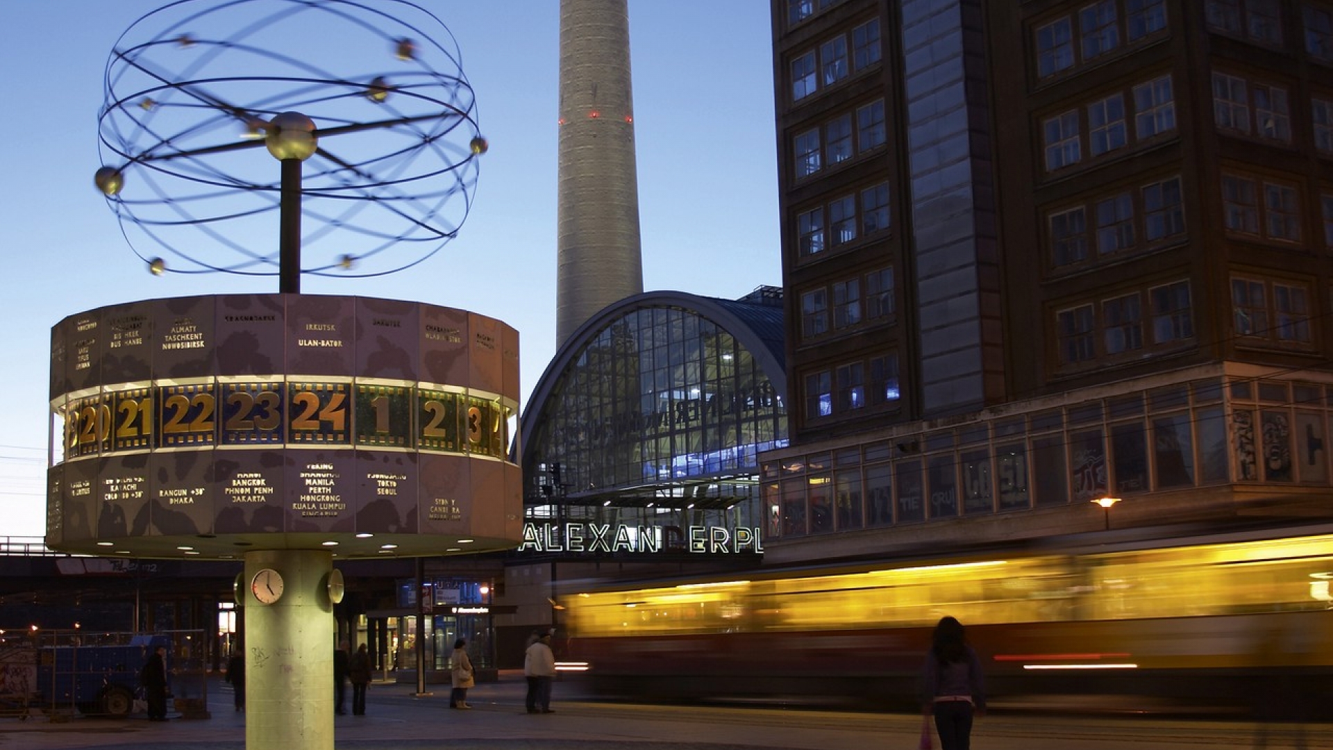 Die Weltzeituhr am Berliner Alexanderplatz. Sie zeigt die Uhrzeiten an den verschiedenen Orten der Erde an.