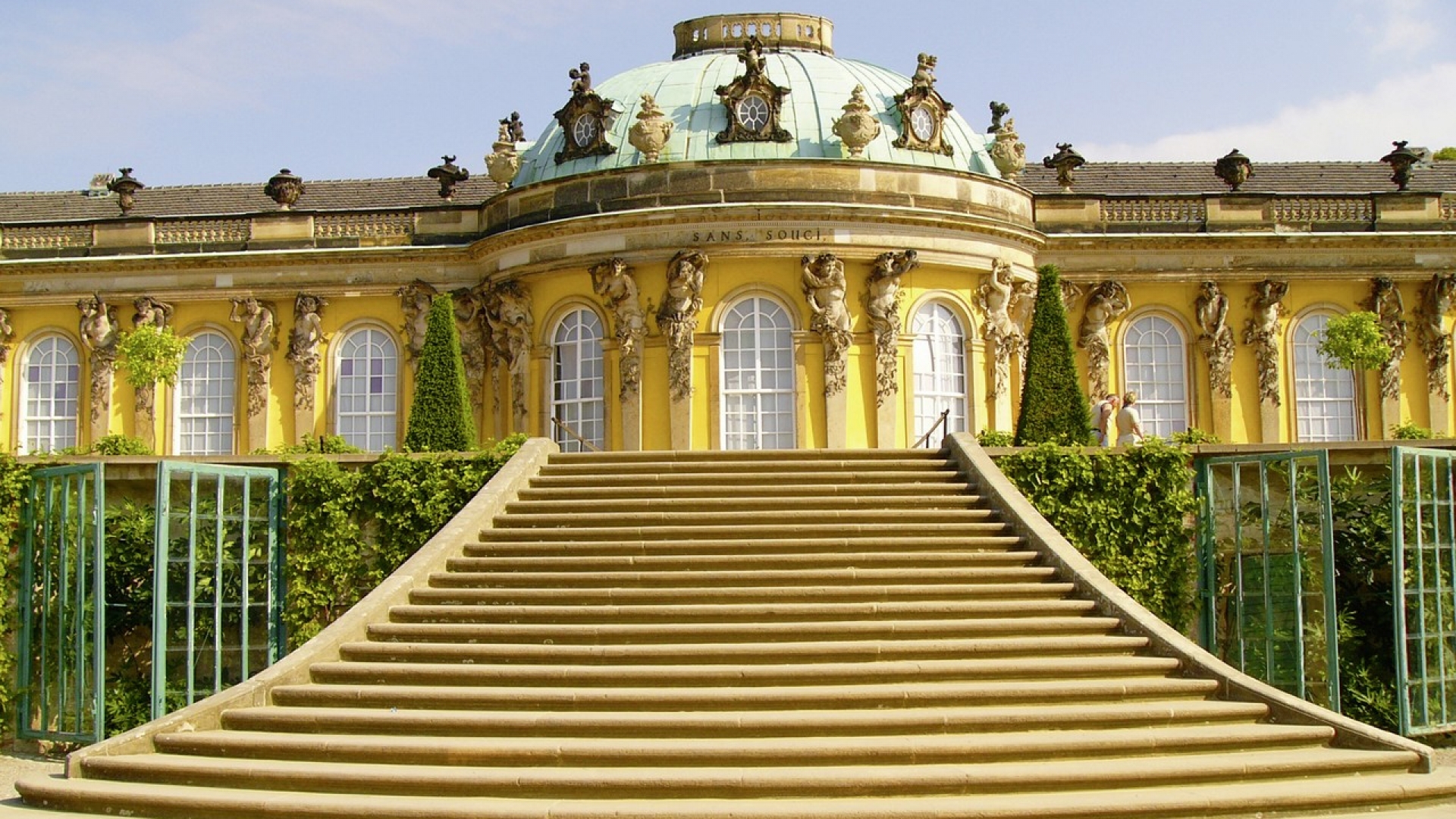Der Anblick erinnert ein bischen an die Spanische Treppe in Rom. Diese Stufen aber gehören zum Schloss Sanssouci in Potsdam. Es ist ein Rokokoschloss mit Park. G.W. Knobelsdorff hat es 1745-1747 erbaut. Friedrich der Große hat sich hier gerne aufgehalten, hier ist er auch gestorben.