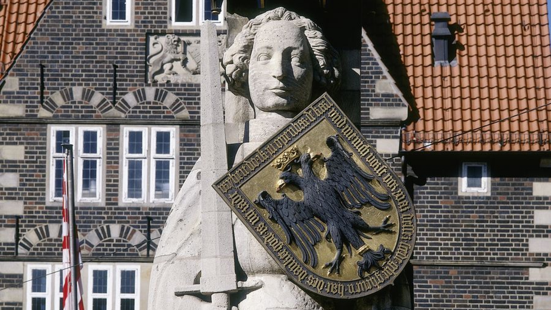 Der Roland steht auf dem Bremer Marktplatz und schaut auf den Dom. Er war von Anfang an eine Symbolfigur für die "Freiheiten" und Rechte der Stadt. Seine Besonderheiten: Der Abstand der Spitzen Knie beträgt genau eine Bremer Elle; die Elle galt früher als Maßeinheit. Und zu Füßen des Rolands ein liegt ein "Krüppel". Der Roland wurde 2004 gemeinsam mit dem Rathaus von der UNESCO zum Weltkulturerbe erklärt und gehört zu den Wahrzeichen Bremens. Bremen ist mit 404 km² das kleinste Land Deutschlands, die Stadt hat 663 000 Einwohner.