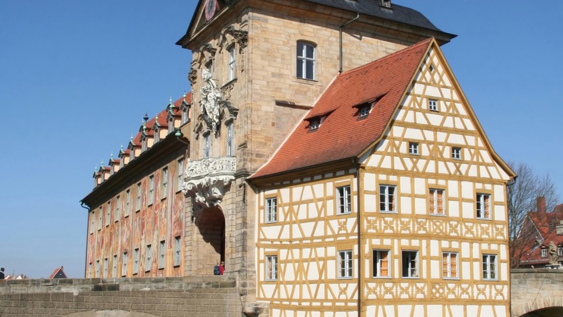 Erstmals erwähnt wurde das Alte Rathaus in Bamberg 1387. Der Sage nach wollte der Bischof von Bamberg den Bürgern keinen Platz für den Bau eines Rathauses gewähren. Deshalb rammten die Bamberger Pfähle in die Regnitz und bauten eine künstliche Insel, auf der sie das Gebäude errichteten. Das Alte Rathauses markiert die alte Herrschaftsgrenze zwischen bischöflicher Berg- und bürgerlicher Inselstadt. Bemerkenswert sind auch die Fresken, vor allem eine Detail: Das Bein einer Putte ragt als Skulptur aus den Wandfresken heraus.