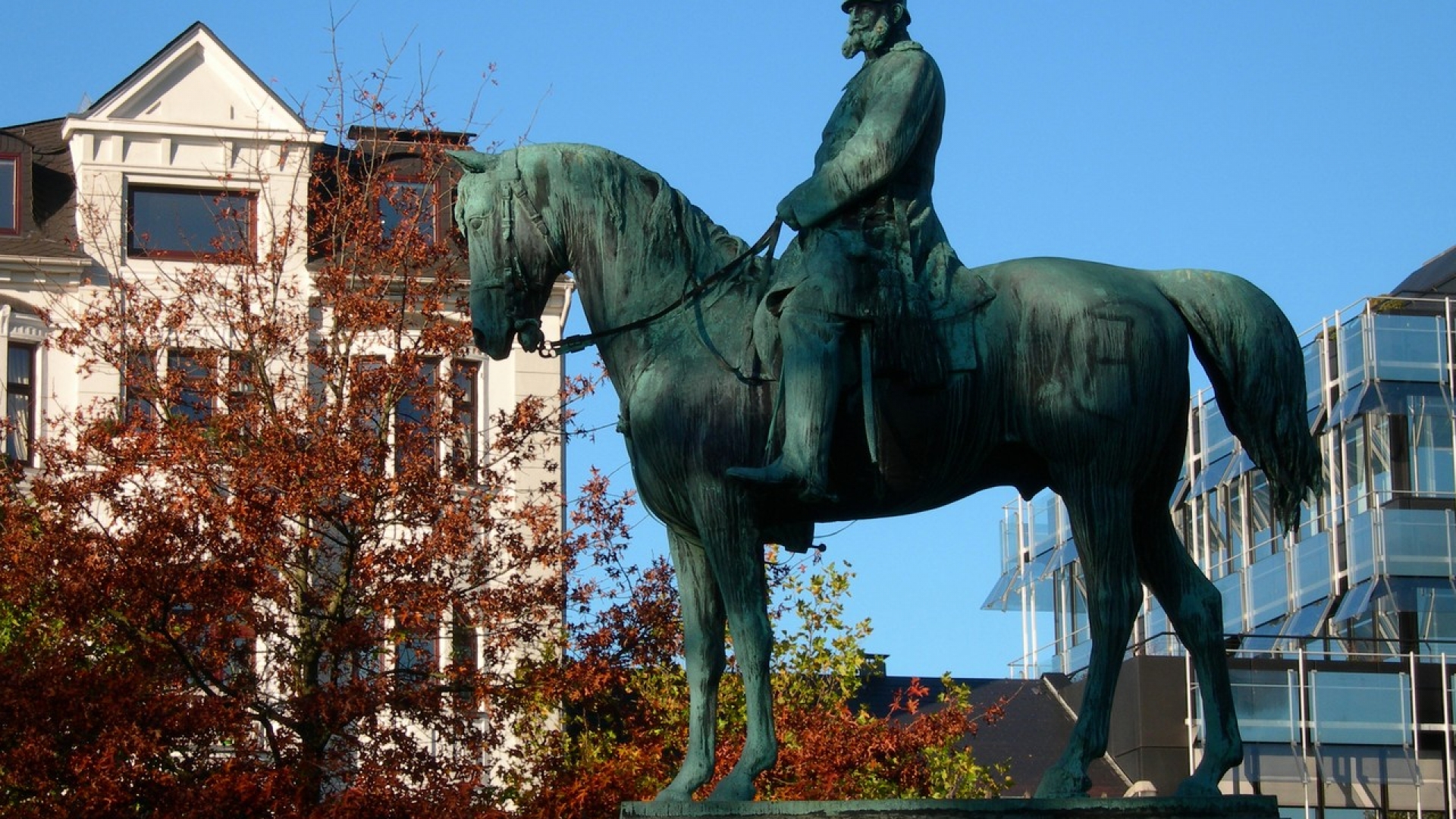 Das Reiterstandbild mit Kaiser Wilhelm I. von Adolf Brütt stammt von 1896. Es steht im Schlossgarten in Kiel. Am Kopf- und Fußende des Sockels standen einmal zwei Soldatenfiguren mit Anker, Schwert und Helm. Wo sie jetzt sind, lässt sich nicht mehr ermitteln. Das Reiterstandbild ist nur eines von vielen Denkmälern, die zu Ehren Kaiser Wilhelms I. errichtet worden sind.