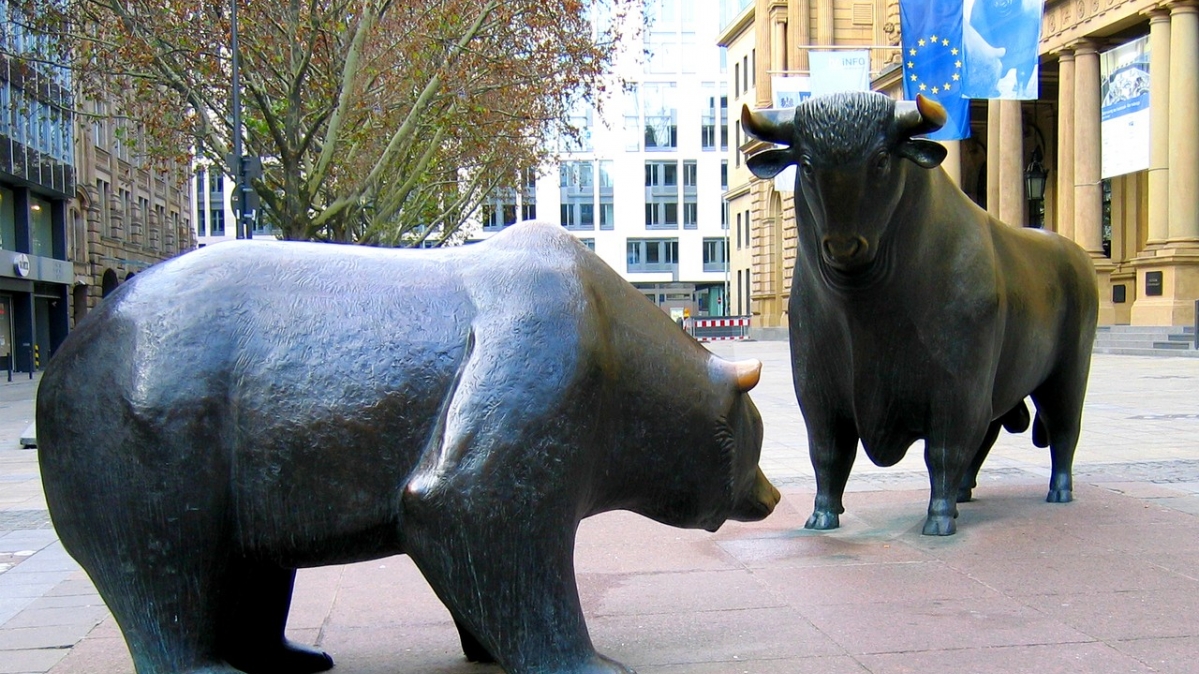Bulle und Bär vor der Frankfurter Börse, eine der wichtigsten Börsen sind in Deutschland.