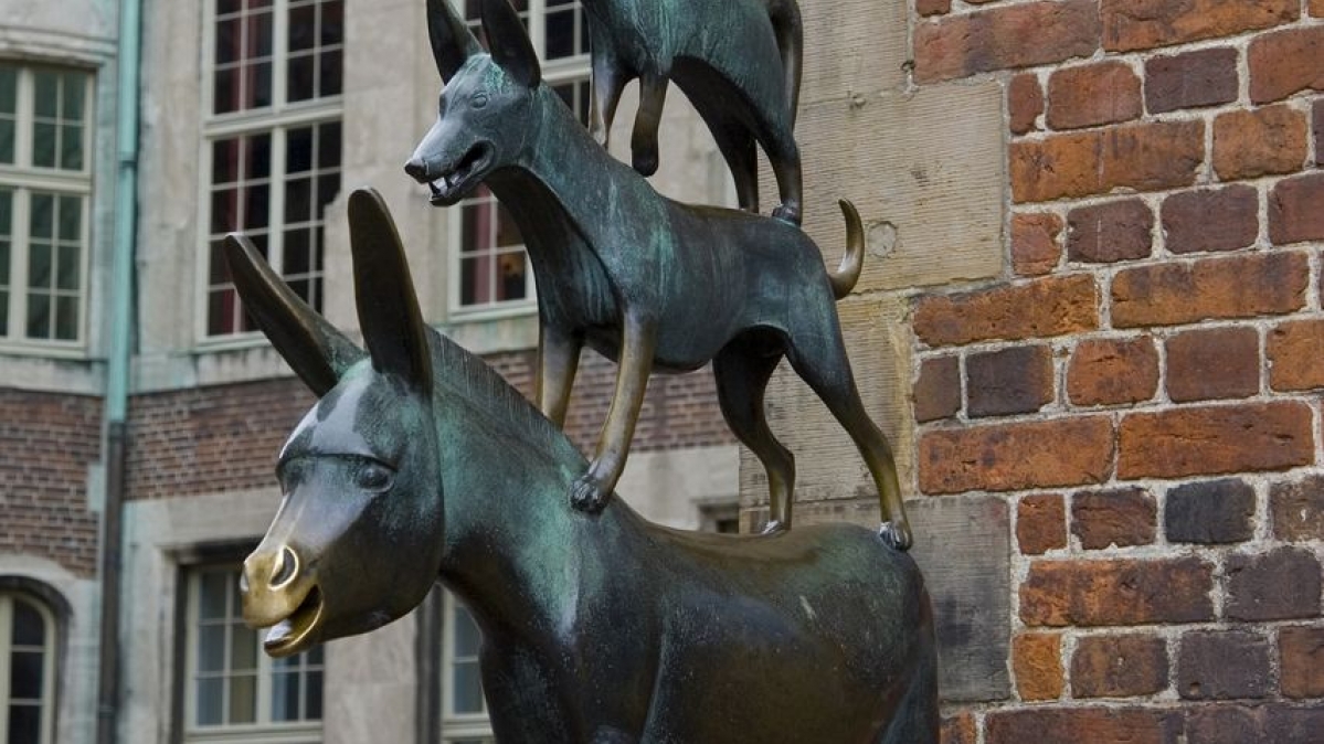 An der linken Seite des Bremer Rathauses steht eine zwei Meter hohe Bronzestatue von Gerhard Marcks, aufgestellt 1953. Der Titel "Die Bremer Stadtmusikanten" satmmt aus einem Märchens der Brüder Grimm. Es spielt im niedersächsischen Umland von Bremen. Esel, Hund, Katze, Hahn fliehen vor ihren Besitzern, weil sie getötet werden sollen. Sie treffen sich zufällig und folgen dem Vorschlag des Esels, in Bremen Stadtmusikanten zu werden.