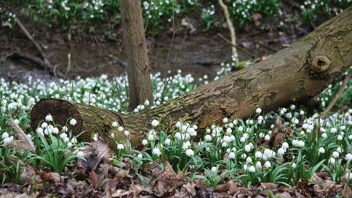Der Märzenbecher wird auch Großes Schneeglöckchen genannt. Wie seine kleinen Verwandten aus der Familie der Amaryllisgewächse trägt er ein Kleid aus Grün und Weiß. Als Standort bevorzugt er lichte Laubwälder. Sobald die ersten Strahlen der Frühlingssonne durch das Geäst fallen und das trockene Laub erwärmen, drängen die Frühlings-Knotenblumen in Scharen aus dem Boden.