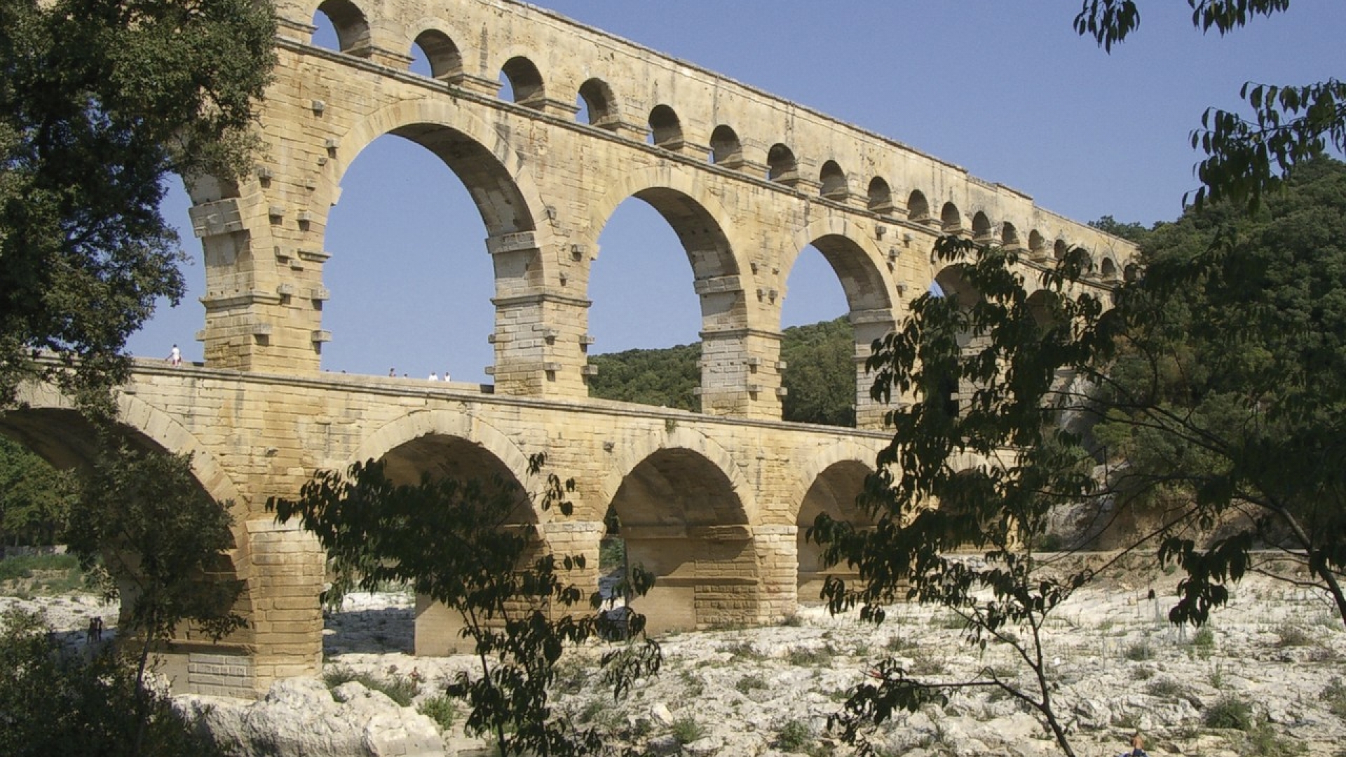 Der knapp 50 Meter hohe und ca. 275 Meter lange Pont du Gard in Südfrankreich stammt aus der Römerzeit und wurde vermutlich im 1. Jahrtausend nach Christus erbaut. Der Pont du Gard überbrückt den Fluss Gardon und ist Bestandteil eines Aquädukts, der von Uzès nach Nîmes führt und über den die Einwohner des römischen Nemausus mit Wasser versorgt wurden. Seit 1985 gehört der gesamte, 50 km lange Aquädukt zum Weltkulturerbe der UNESCO.