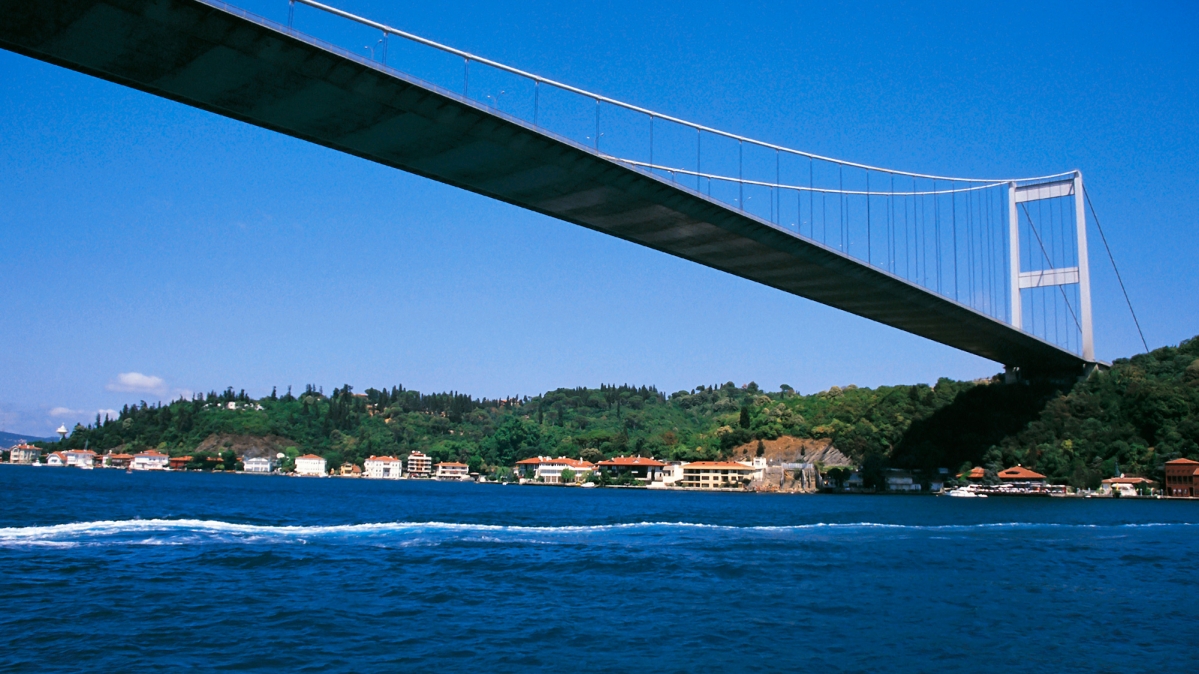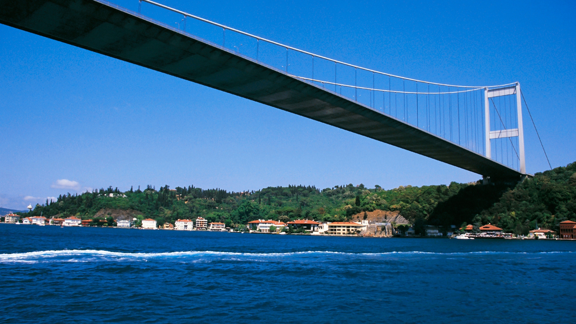 Blau schimmert das Meer unter der Fatih-Sultan-Mehmed-Brücke in Istanbul, die auch 2. Bosporus-Brücke genannt wird. Seit 1988 verbindet sie zwei Kontinente - den europäischen mit dem asiatischen Teil der Stadt.
