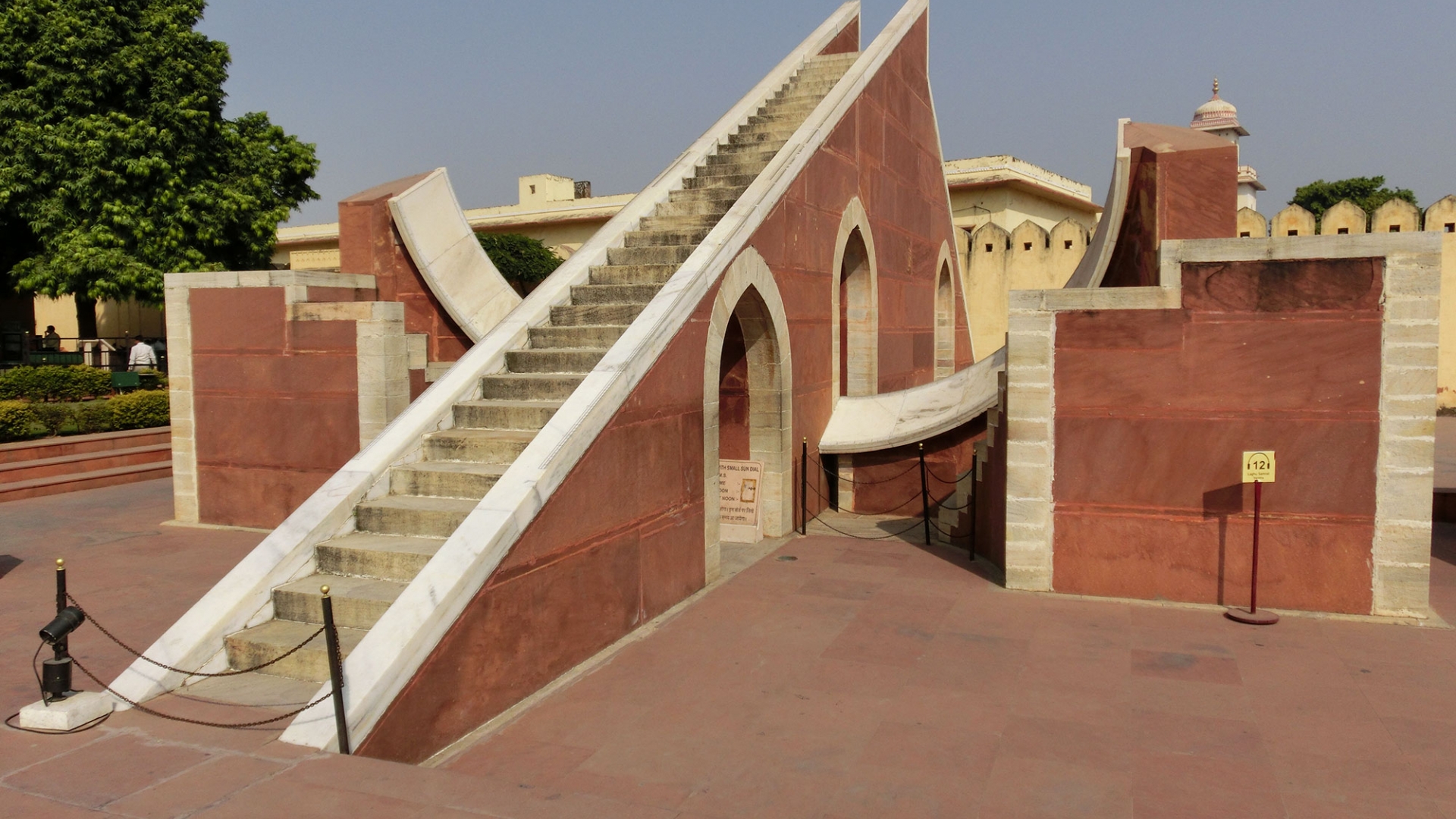 Unter freiem Himmel stehen in der historischen Sternwarte Jaipurs allerlei kurios anmutende Bauwerke und Instrumente aus dem 18. Jahrhundert. Sie dienten dazu, die Position der Sonne und anderer Himmelskörper zu bestimmen. Im Bild zu sehen ist die kleinere von zwei Sonnenuhren. Der Schatten der Treppe fällt auf den hellen Steinbogen, wo man die Uhrzeit abliest.