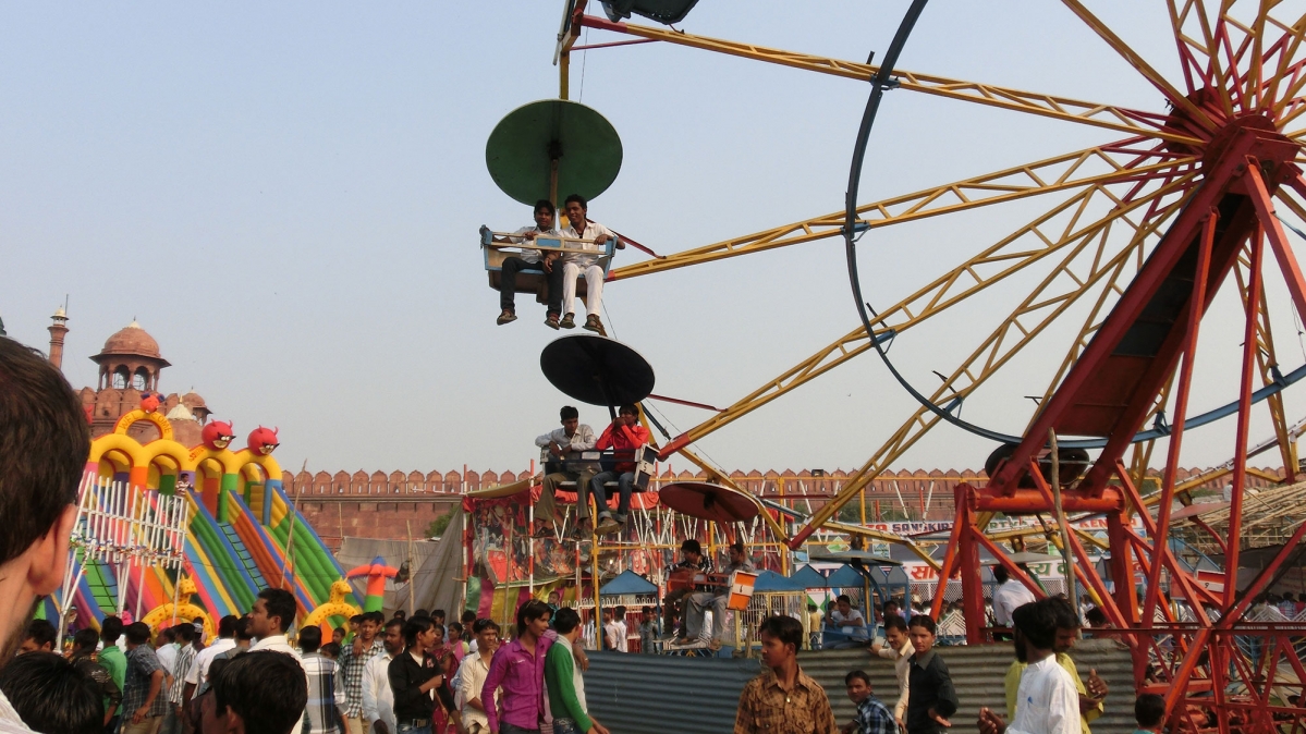 Jahrmarkt vor den Toren der Roten Festung in Delhi: Fahrgeschäfte, Süßigkeiten, Musik und aufgedonnerte Jugendliche – zum Oktoberfest fehlt eigentlich nur das Bierzelt. Alkoholische Getränke sind im Norden Indiens jedoch bei weitem nicht so üblich wie in Europa. Viele Restaurants bieten weder Bier noch Wein an und so ist es keine Überraschung, dass auf dem Volksfest nur Limonade verkauft wird.